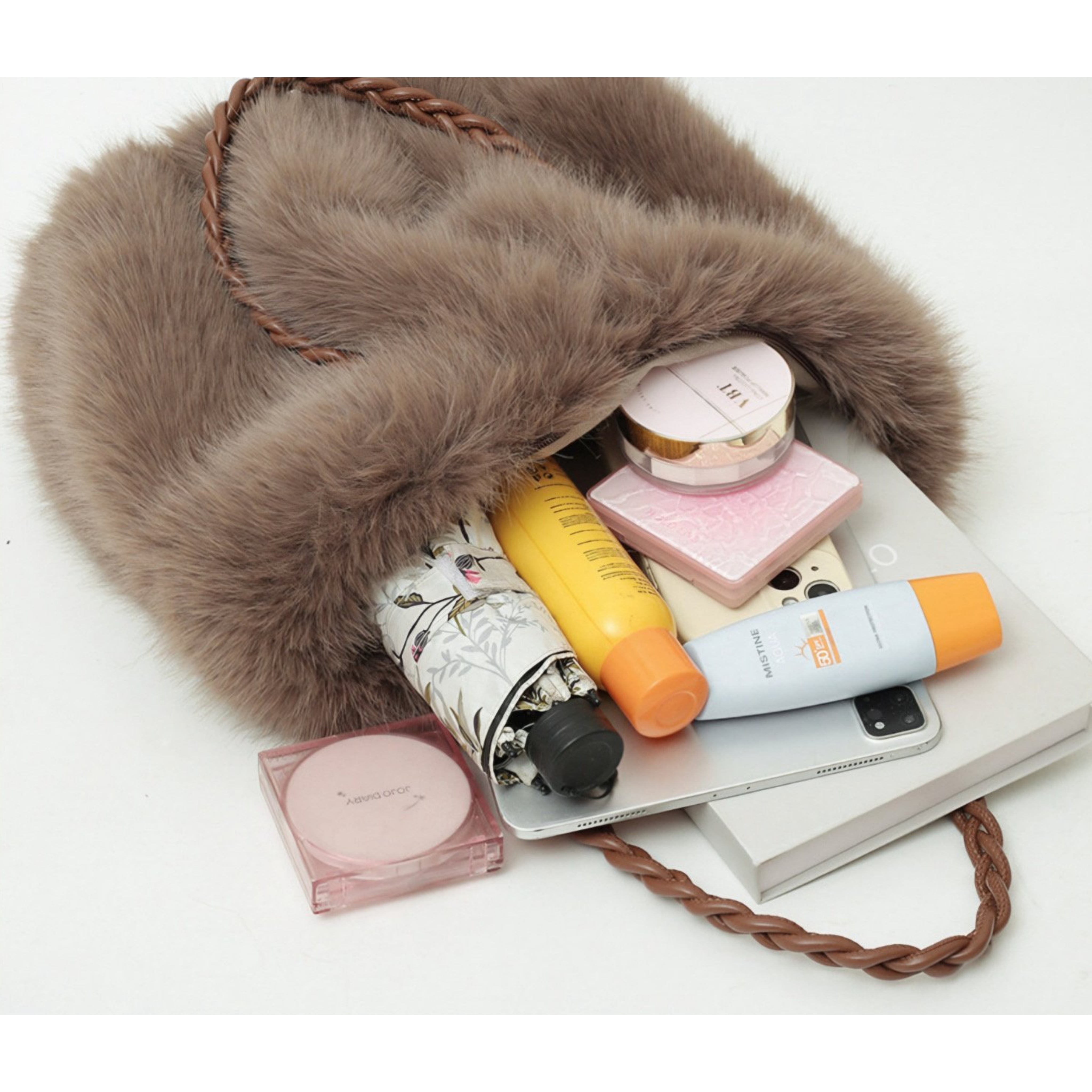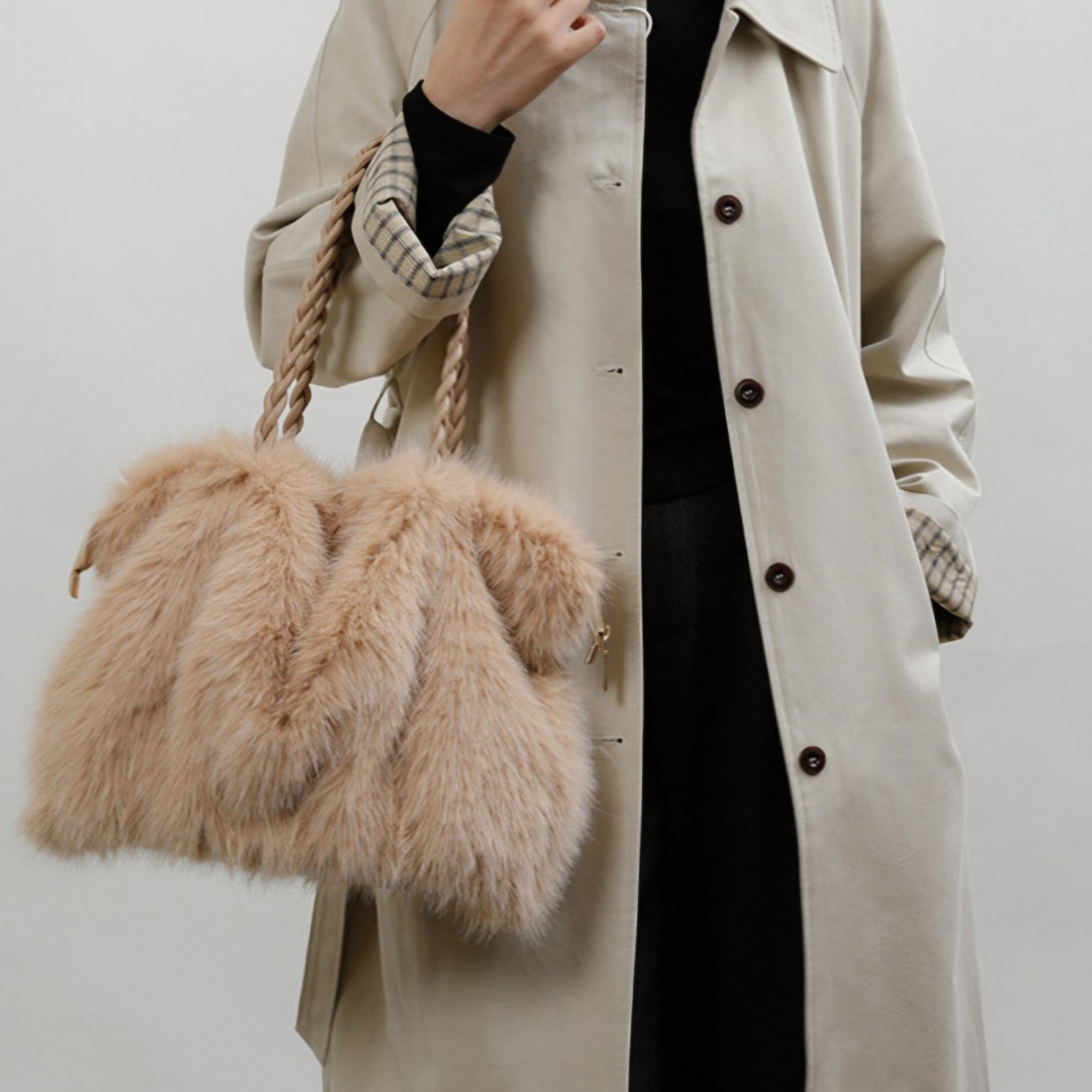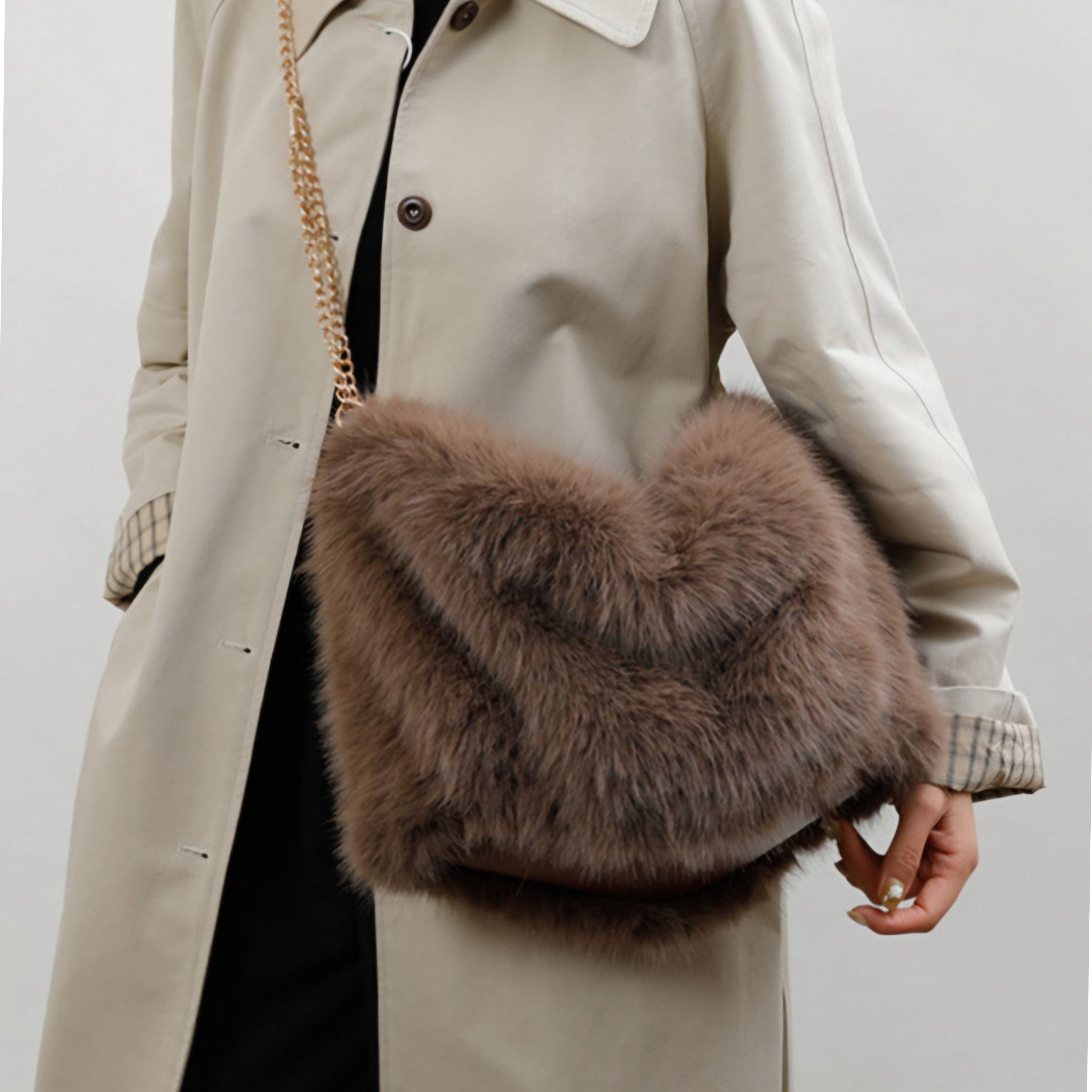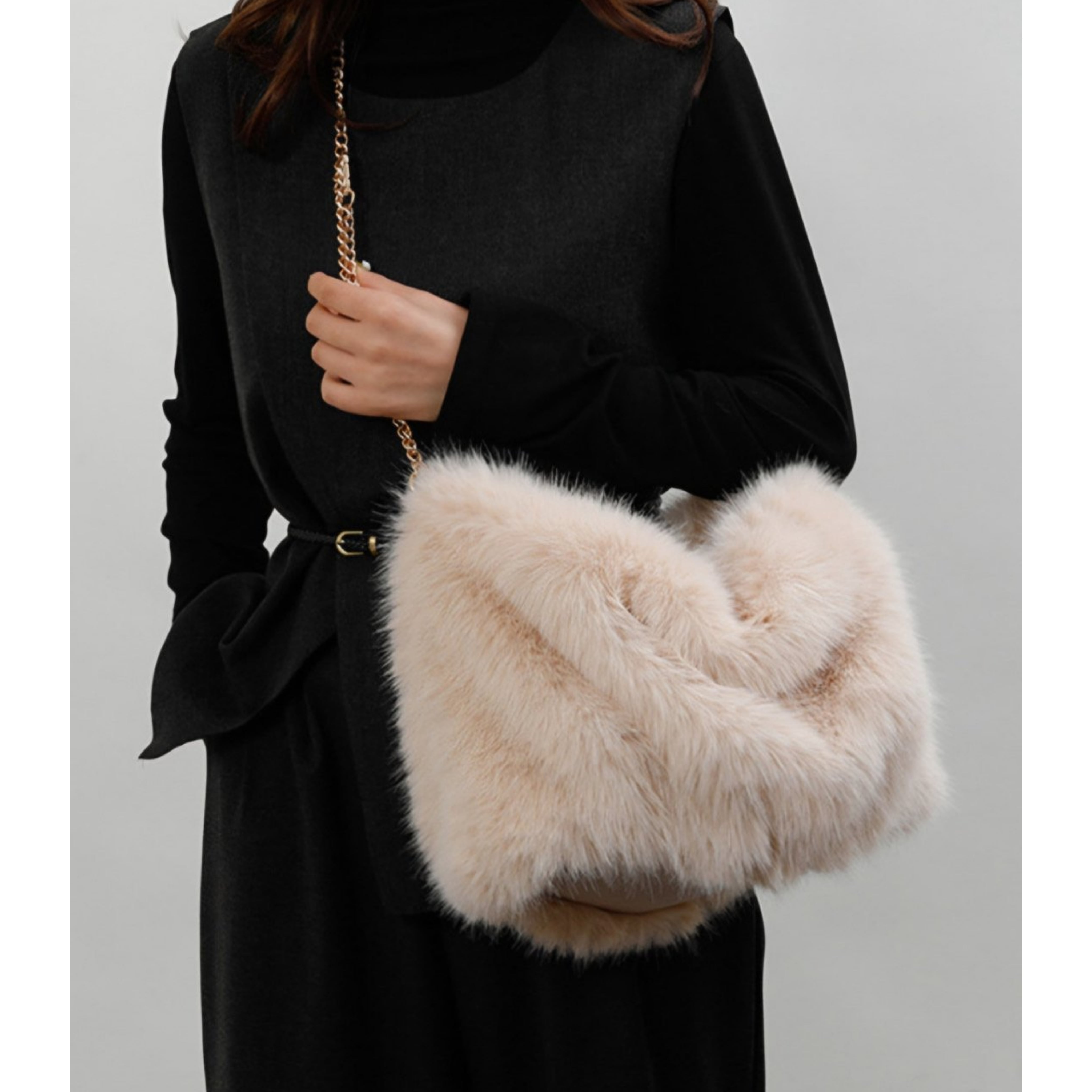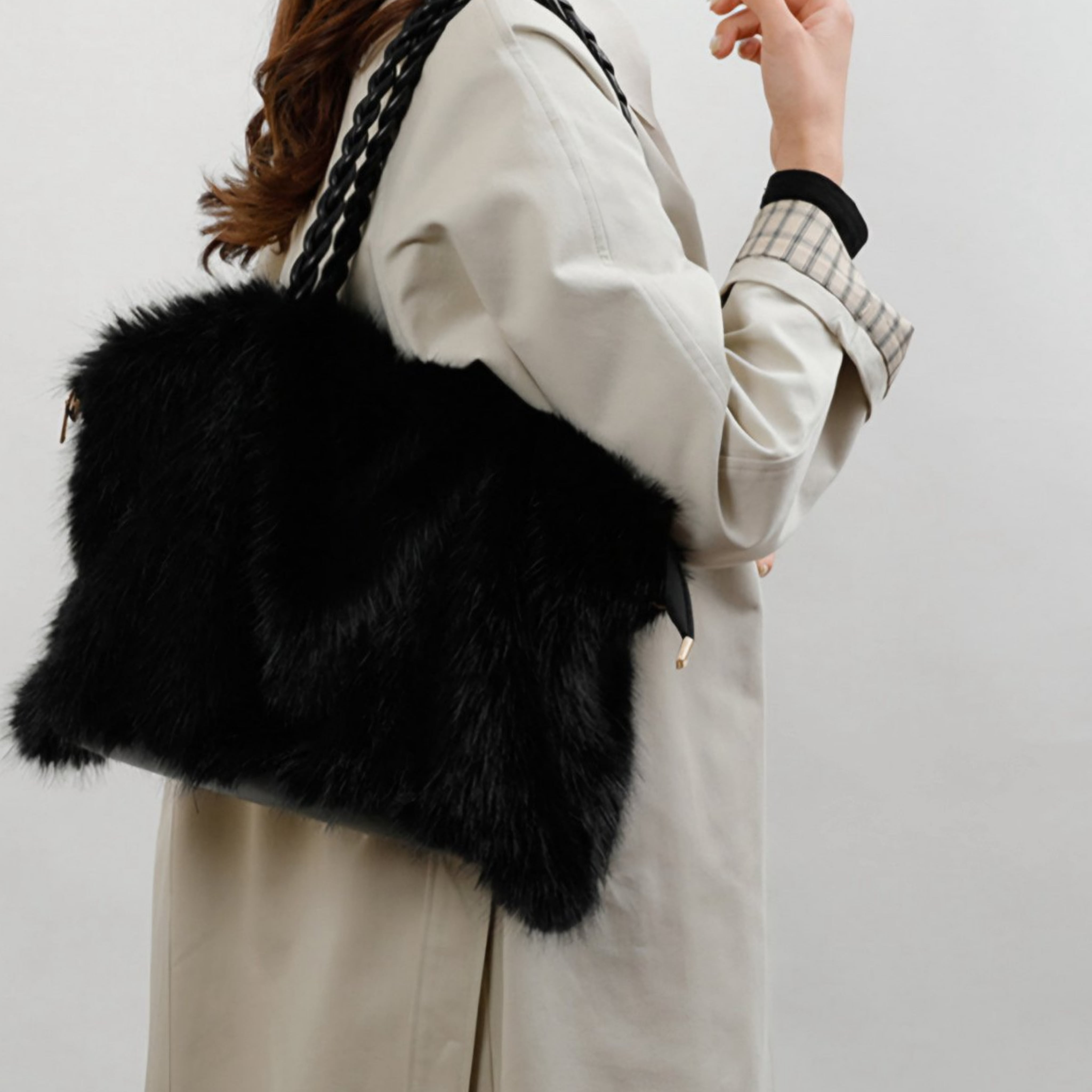 肌触りの良さが特長のこのバッグは、デイリーから特別なシーンまでどんなシーンにもぴったりです。豊富な収納力を兼ね備え、内部には整理整頓がしやすいスペースが設けられているため、小物の収納も簡単です。柔らかなフェイクミンク素材は、持つだけで気分を上げてくれる逸品です。