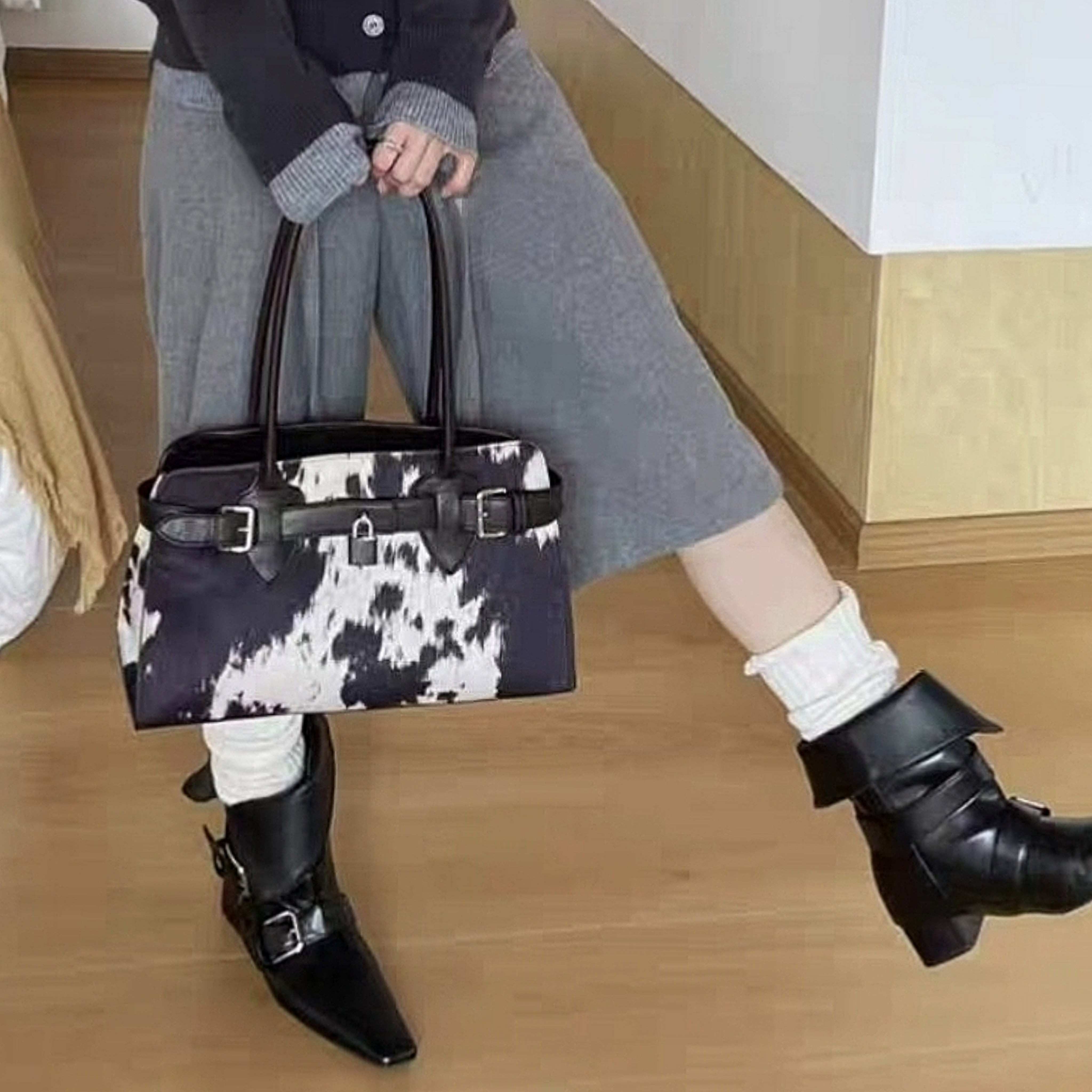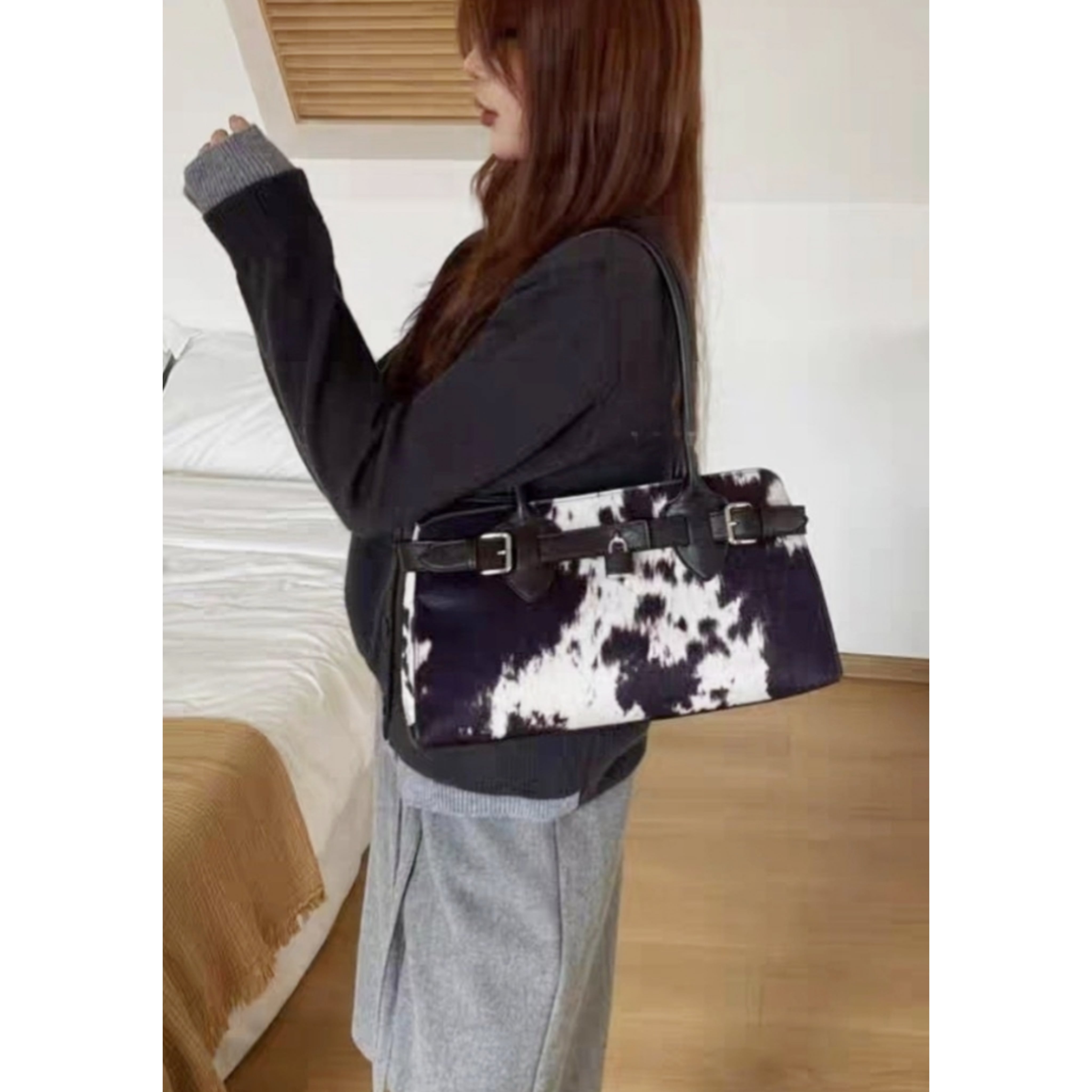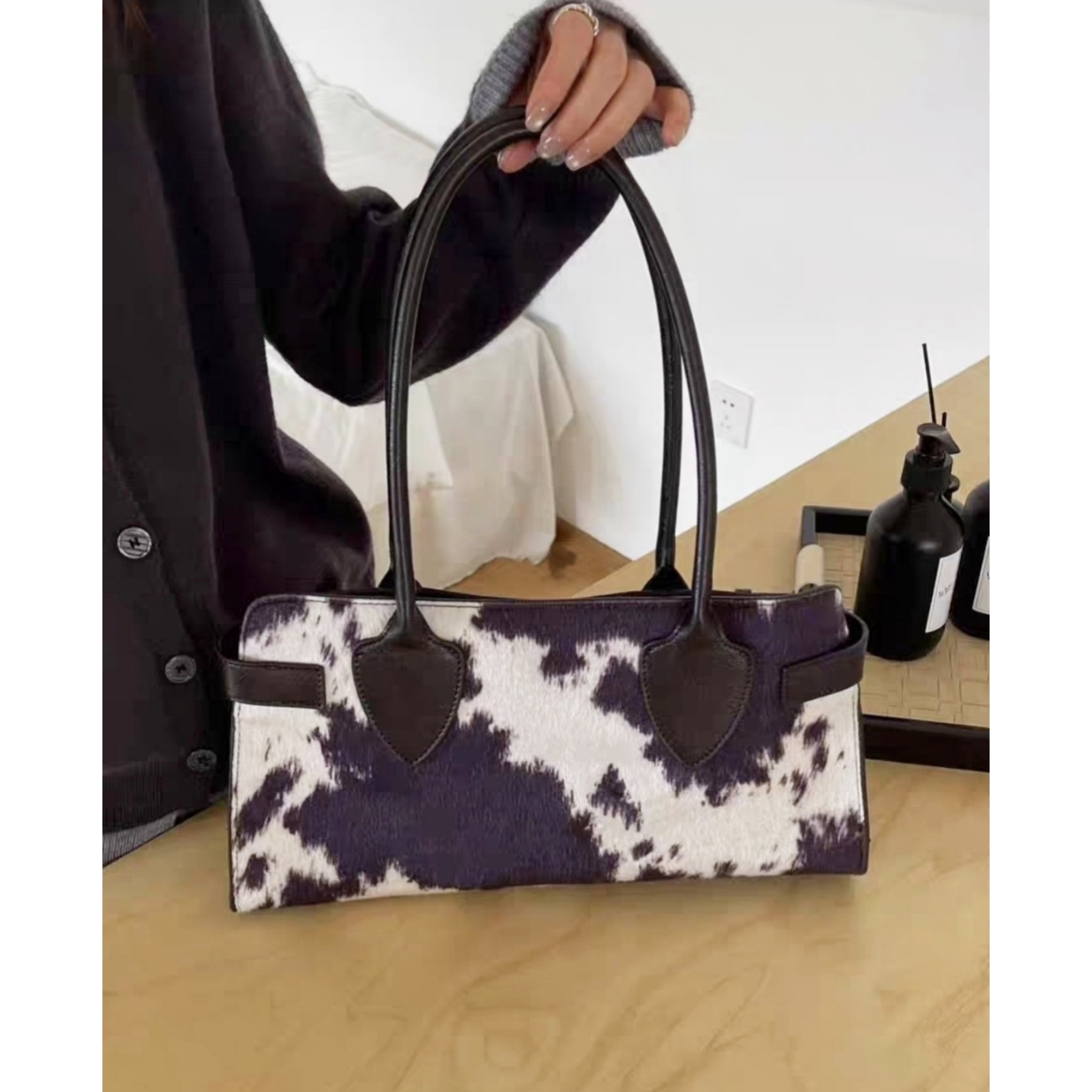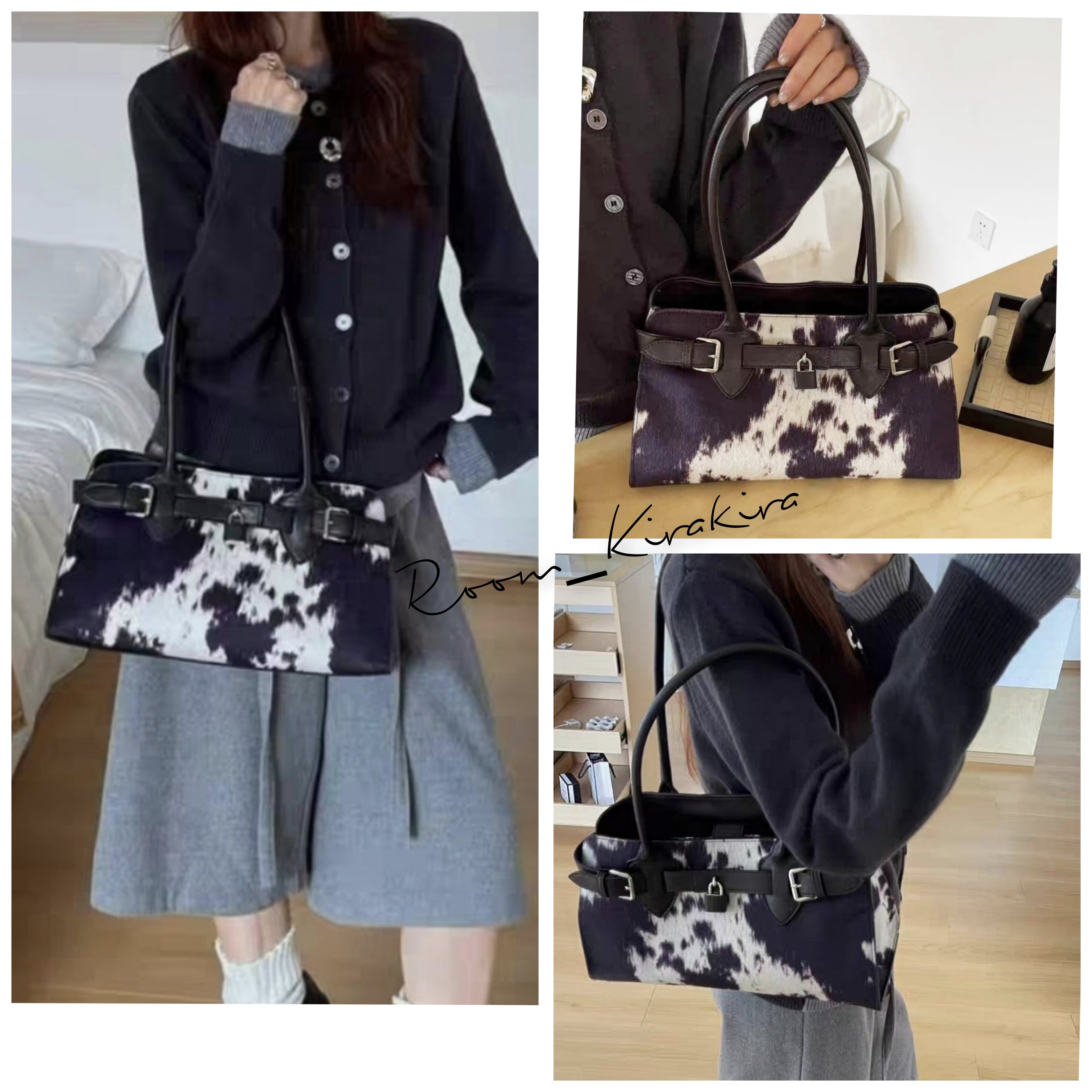 サイズはW36/H20/D12cm。お色はホワイトベースに可愛らしいミルキー柄のデザインです。素材は高級感溢れる子牛のヌメ革を使用しており、贅沢な質感を楽しめます。