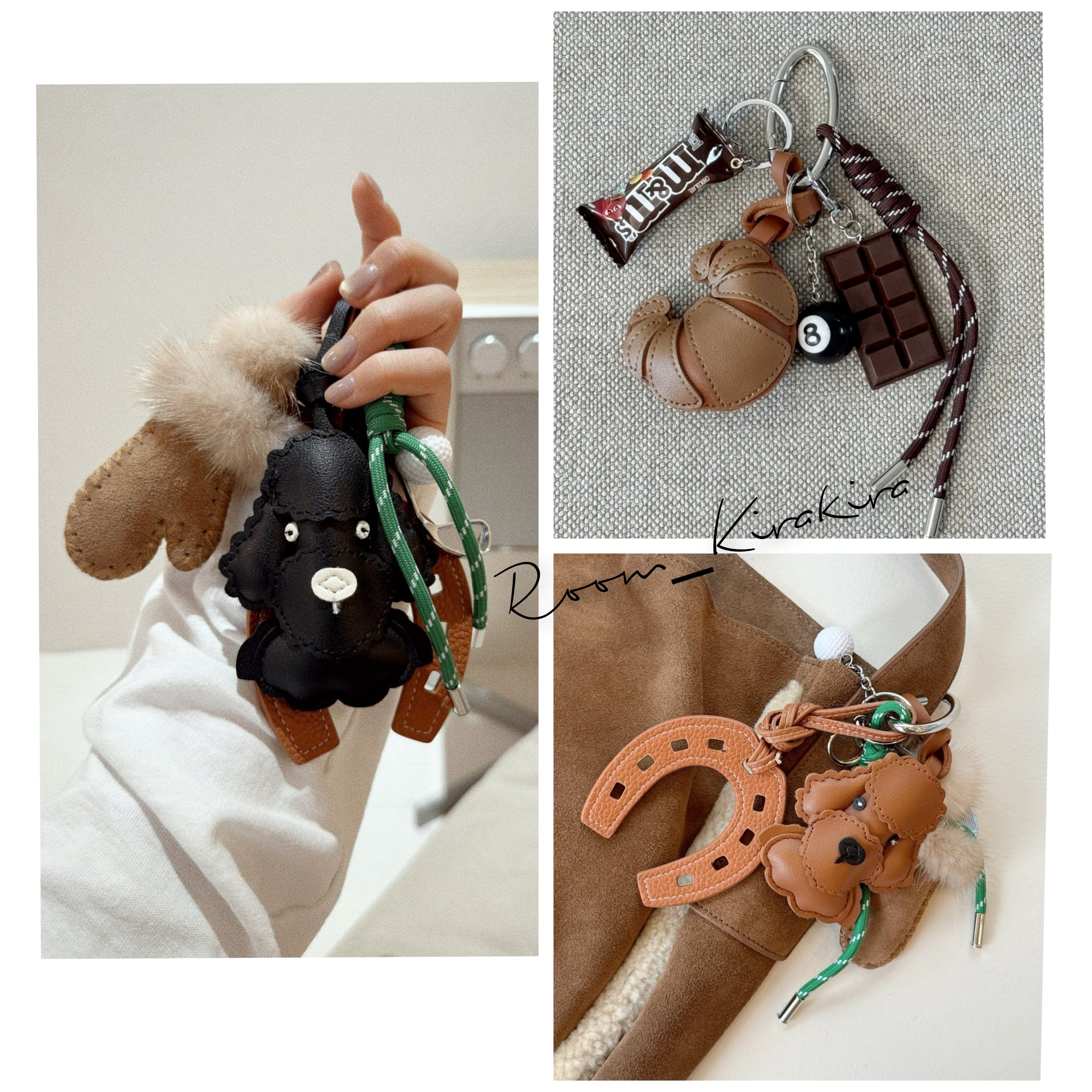 このプードル&クロワッサンチャームは、バッグチャームとキーリングの2way仕様で、様々なシーンでお楽しみいただけます。カジュアルな普段使いはもちろん、特別なお出かけにもぴったりなアクセントになります。また、ループ、グローブ、チョコレートなどの愛らしいアイテムが、心を和ませることでしょう。