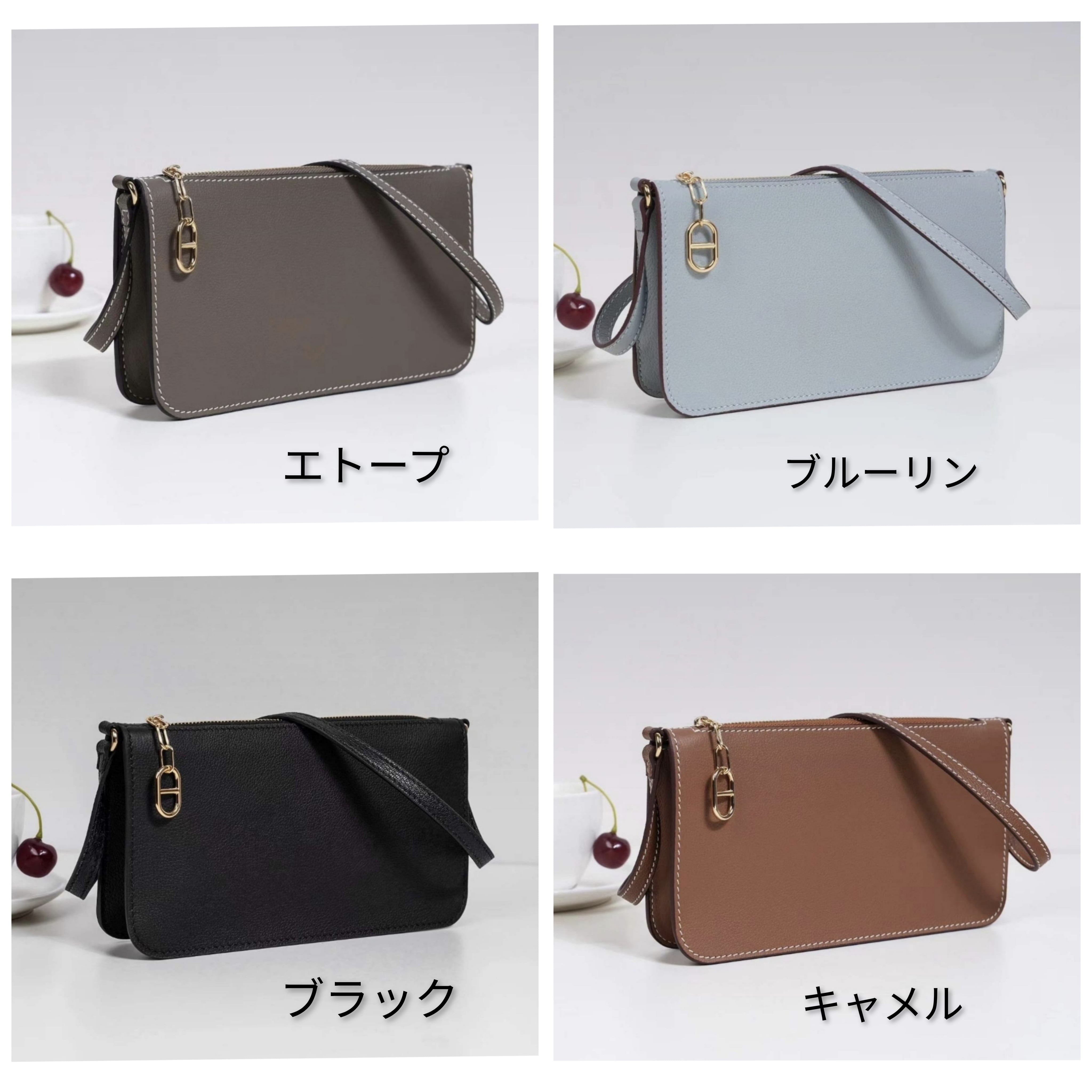 お色はエトープ、ブラック、キャメル、ブルーリンの4タイプ、サイズはW22/H12/D3cmの展開です。上質な牛革を使用し、シャルダンチャームが洒落たアクセントを加えています。