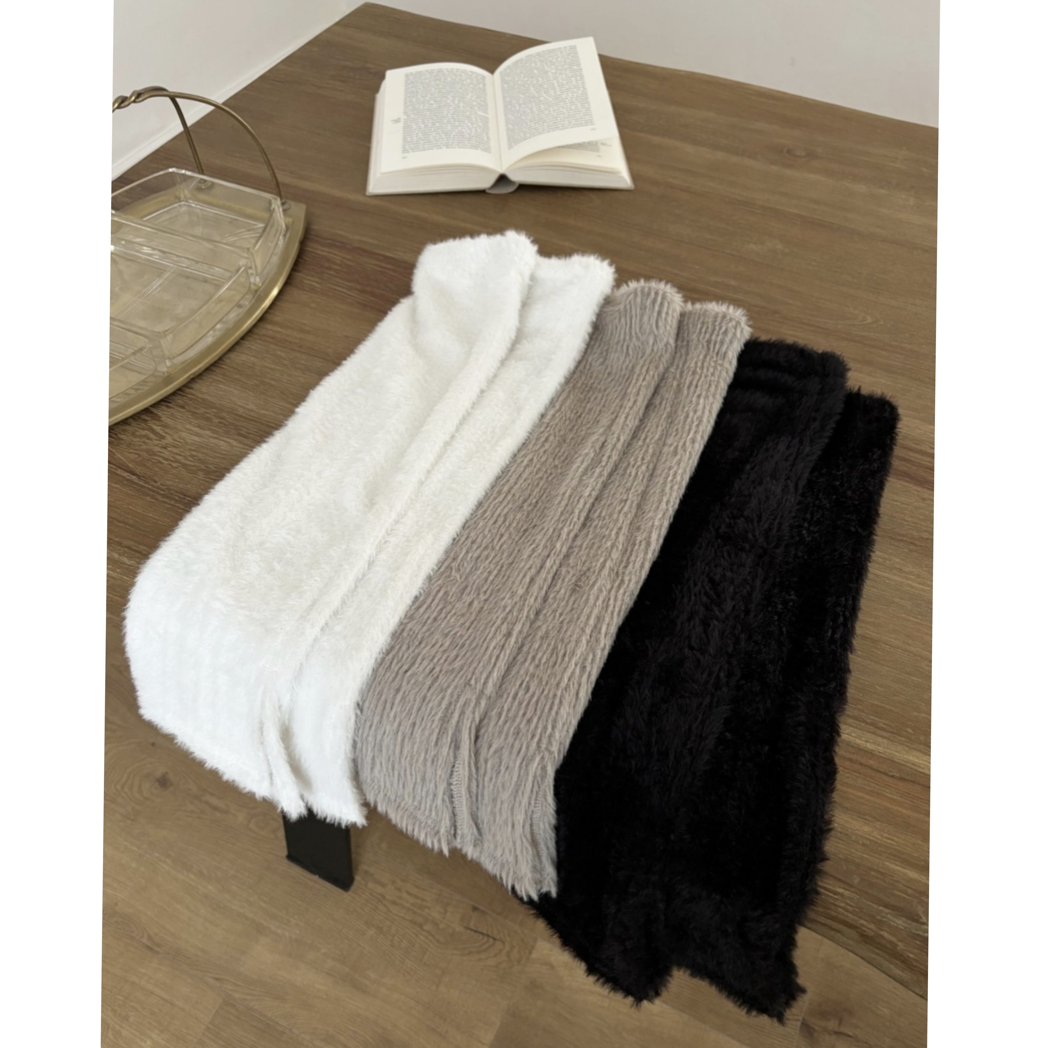 お色は、ブラック、ホワイト、グレーの3タイプを展開しています。サイズはFreeで、どなたでも快適にお使いいただけるデザインです。アクリルとポリエステルを混合した素材を使用し、カシミヤタッチの柔らかな肌触りが特徴です。抜群の保温性を誇り、冷えた足元をしっかりと暖かく守ります。