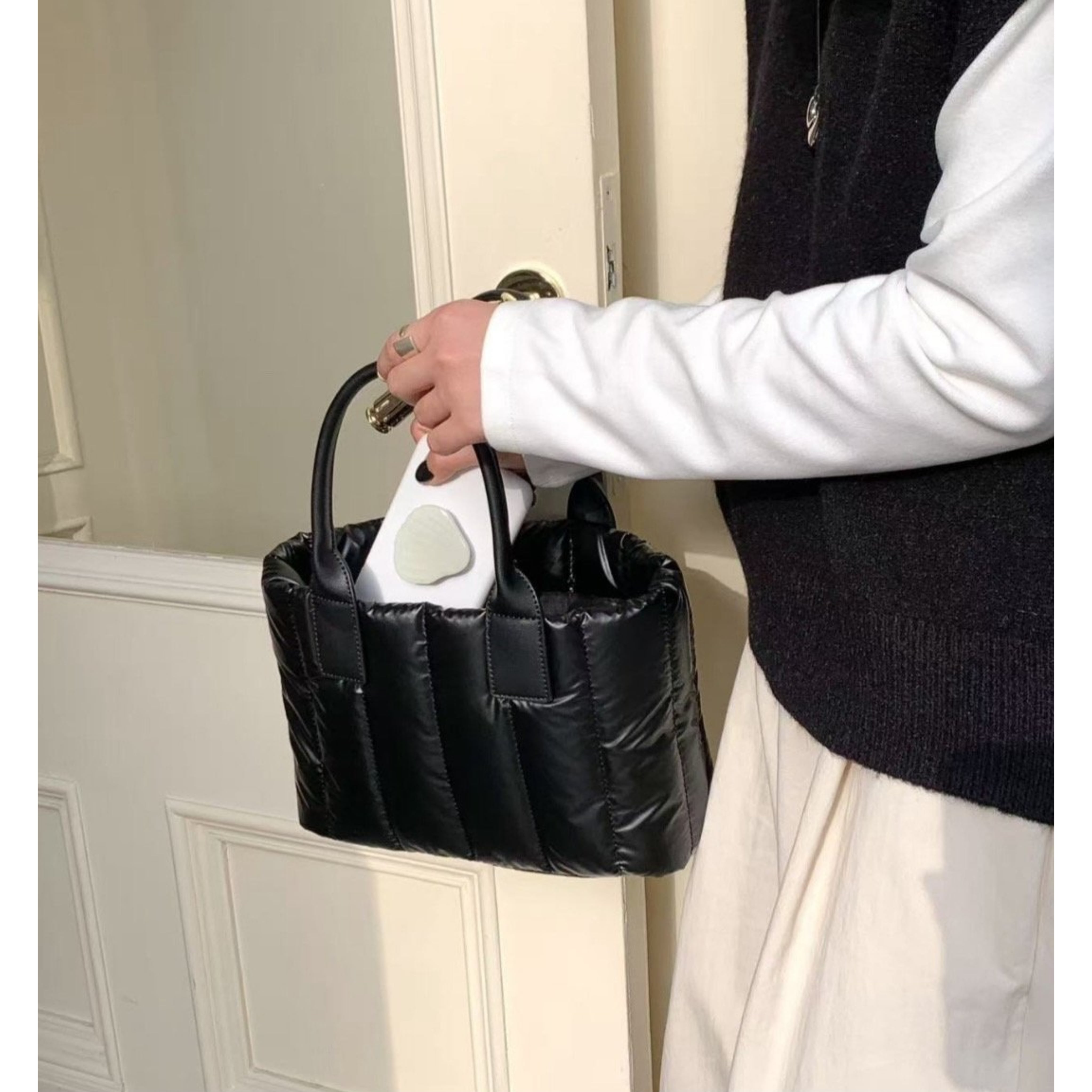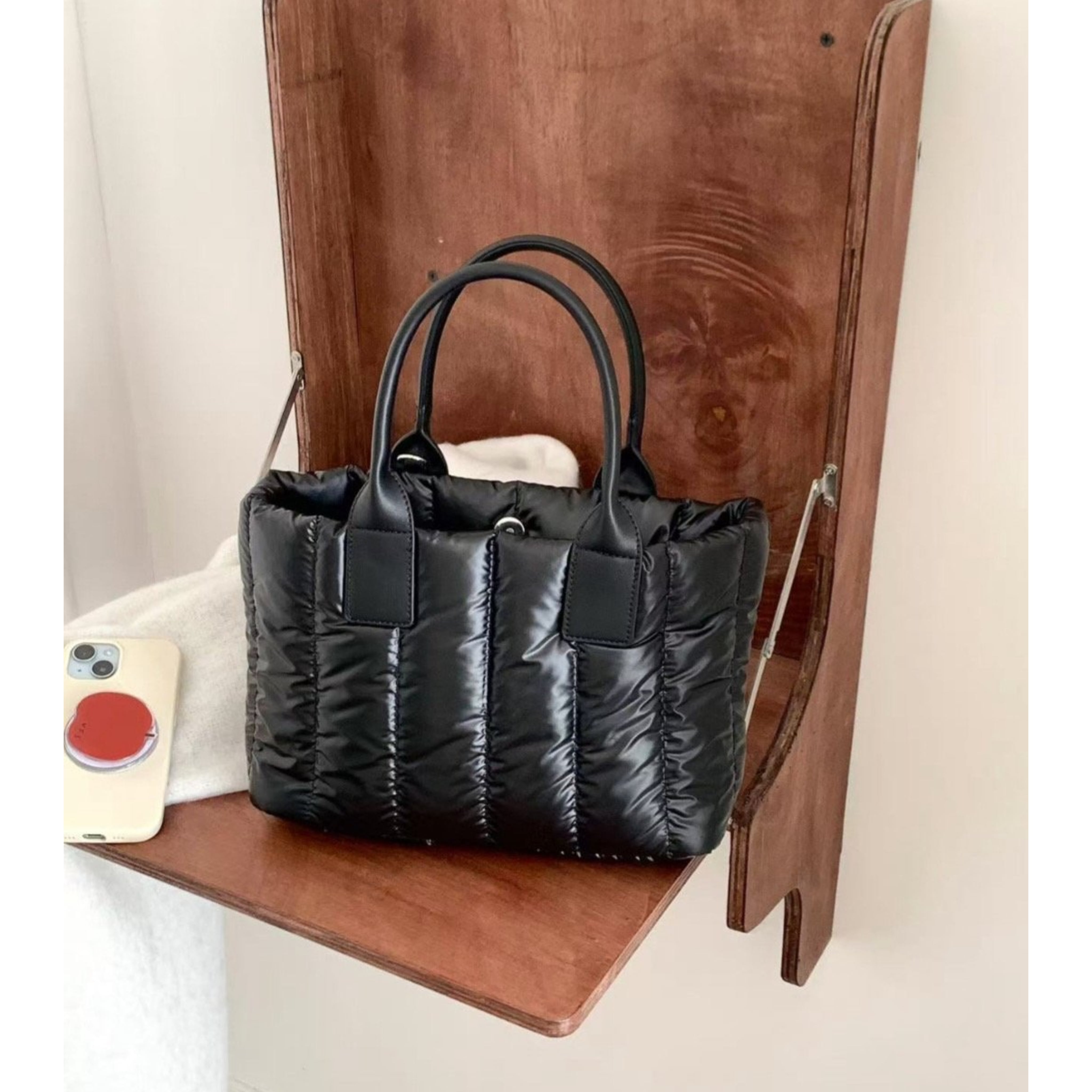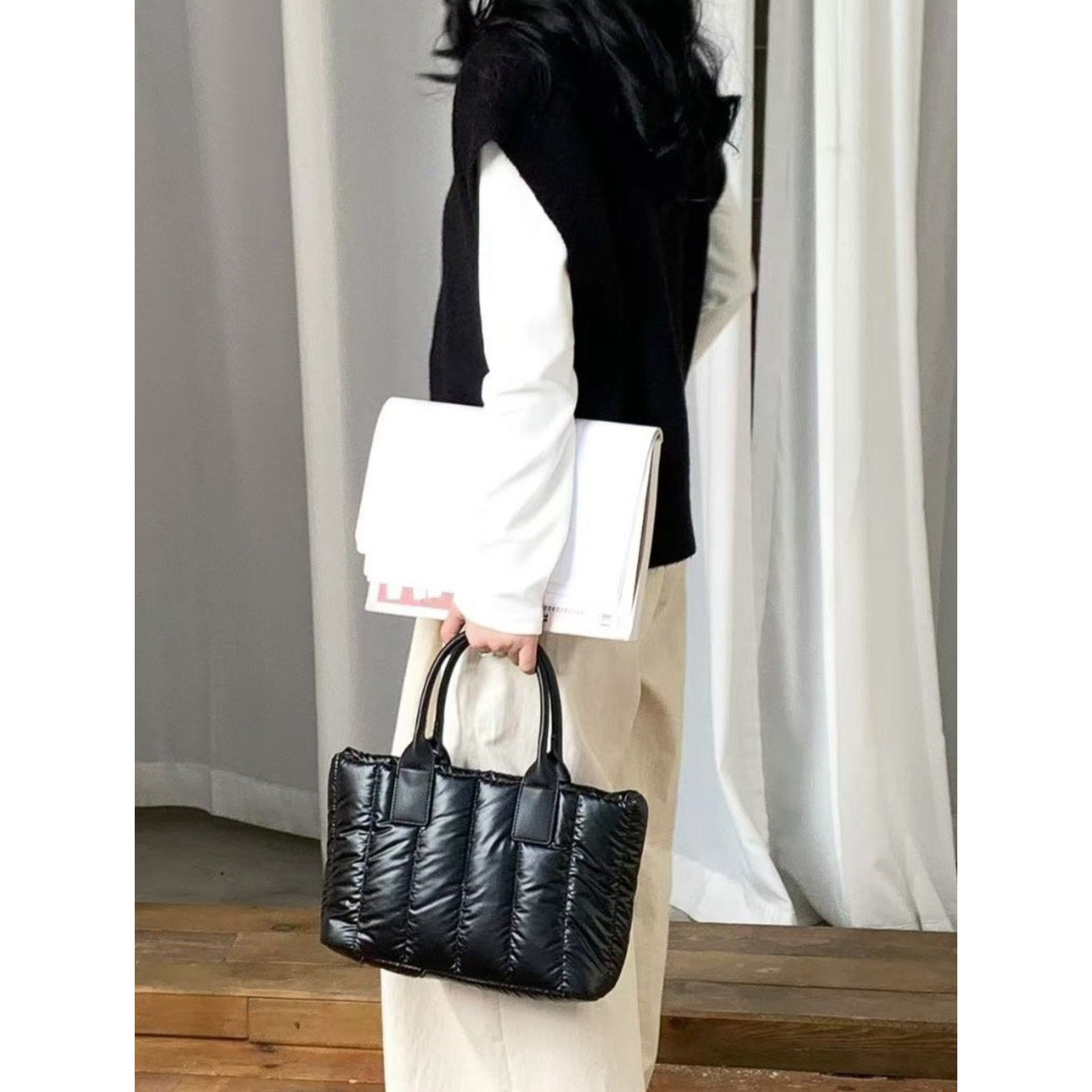 お色は、シックなブラック、華やかなシルバー、トレンド感溢れるカーキーの3タイプをご用意。サイズはW33/H21/D10cmで、程良い大きさながらも十分な収納力を誇ります。素材は撥水性に優れたペディング仕様のナイロンを使用しており、軽やかで持ち運びもラクラクです。