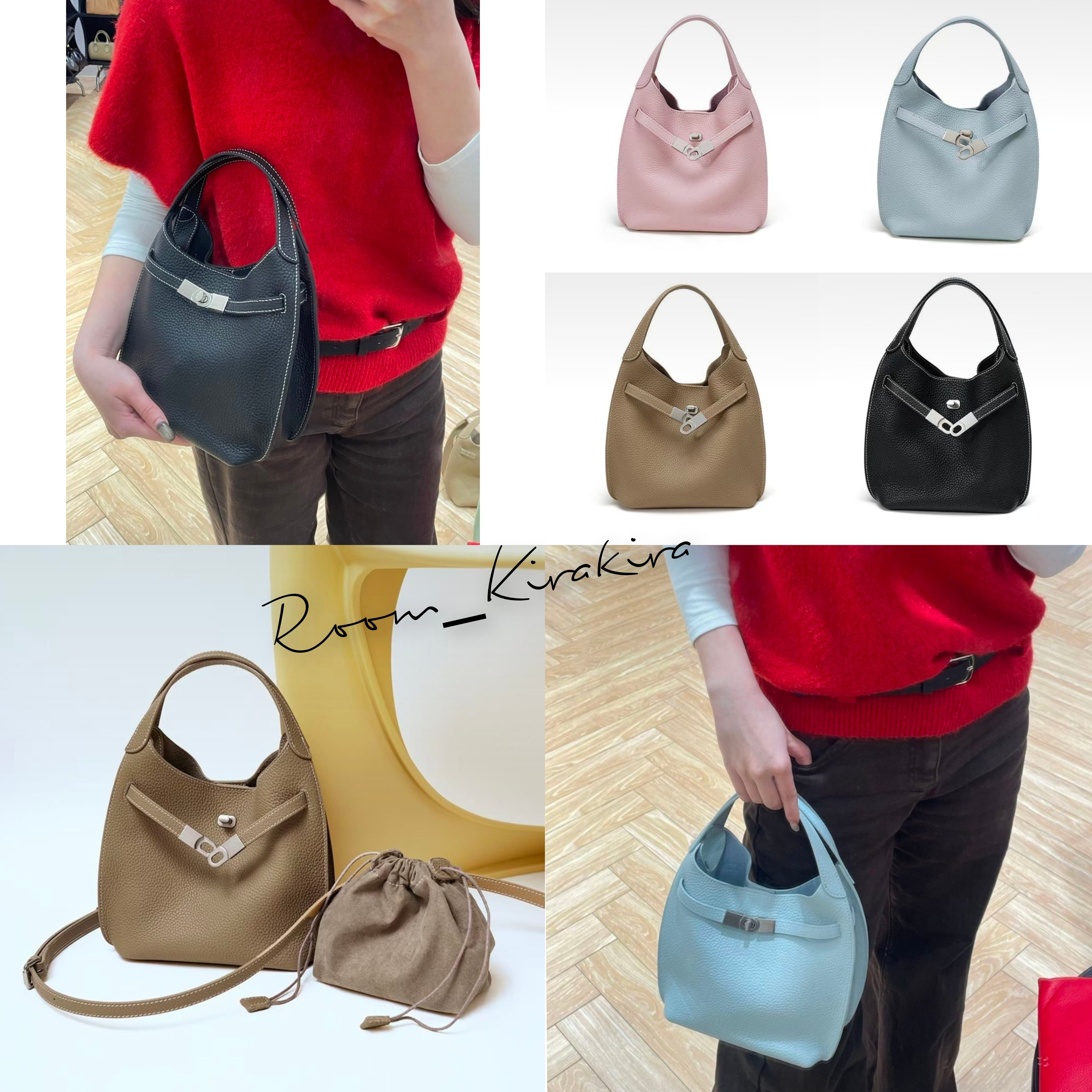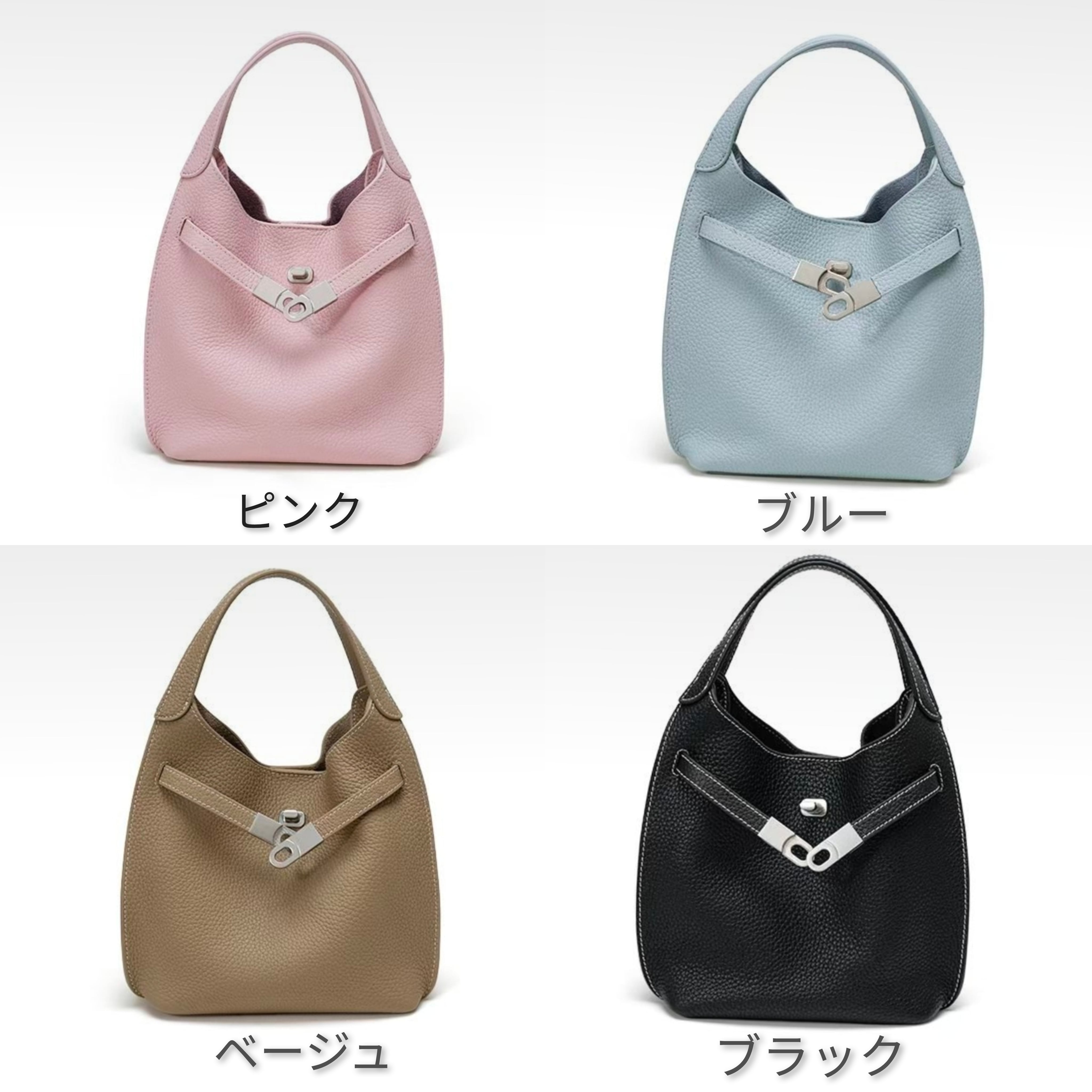 お色は、可愛らしいピンク、シックなベージュ、爽やかなブルー、スタイリッシュなブラックの4タイプをご用意。サイズはW18H28D9cmで、コンパクトながらもデイリーユースにぴったりのサイズ感です。高品質な牛革製を使用しており、耐久性もありお手入れも簡単です。