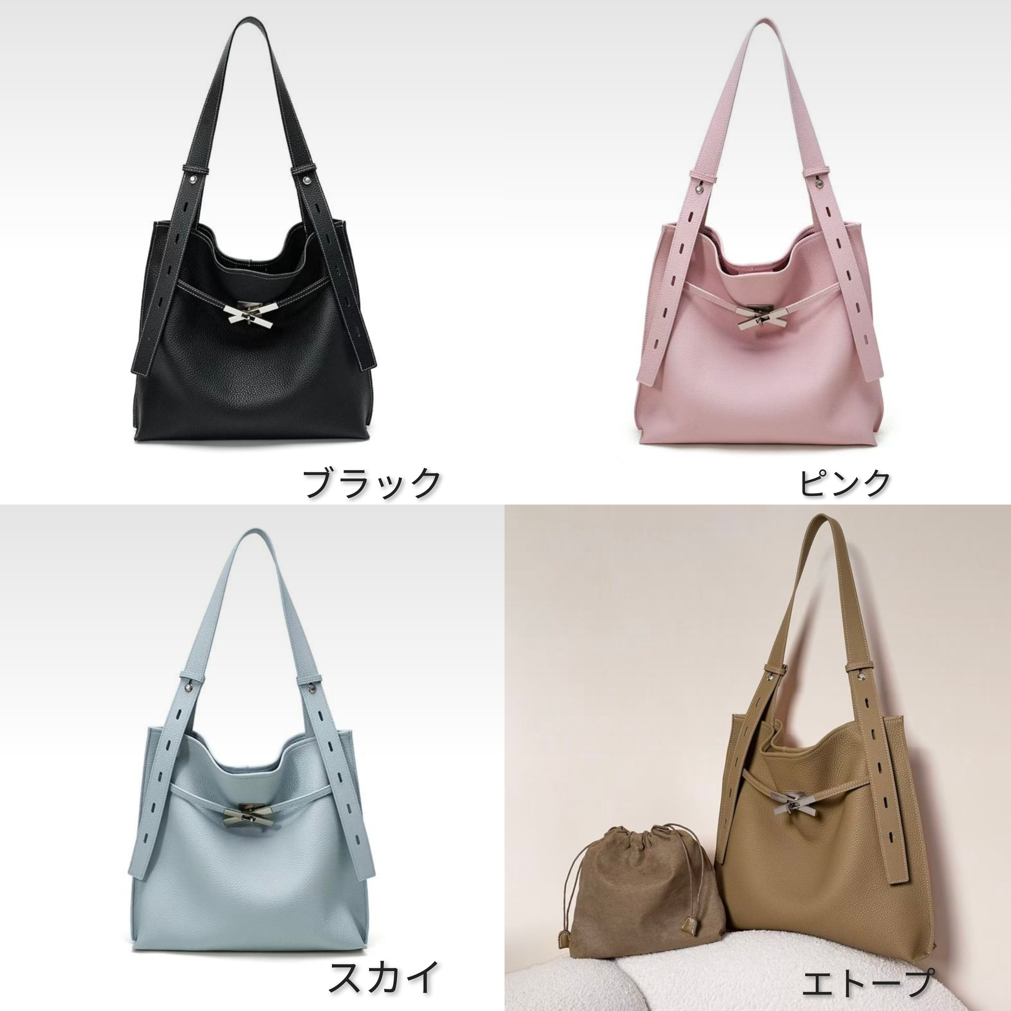 お色は、シンプルで洗練されたブラック、落ち着いたエトープ、そして柔らかなベージュ、爽やかなスカイの全4タイプをご用意。サイズはW32H30D8cmで、シンプルながらも洗練された大きさが特長です。上質な牛革を使用しており、軽やかな持ち心地と高級感を実現しています。