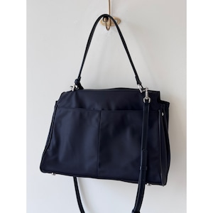 お色はシンプルで洗練されたブラックのワンカラーで、男女問わず使いやすいデザインが特長です。サイズはW35H25D10cmで、撥水性に優れたナイロン素材を使用しており、安心してお使いいただけます。収納力抜群で書類、パソコン収納も可能です。