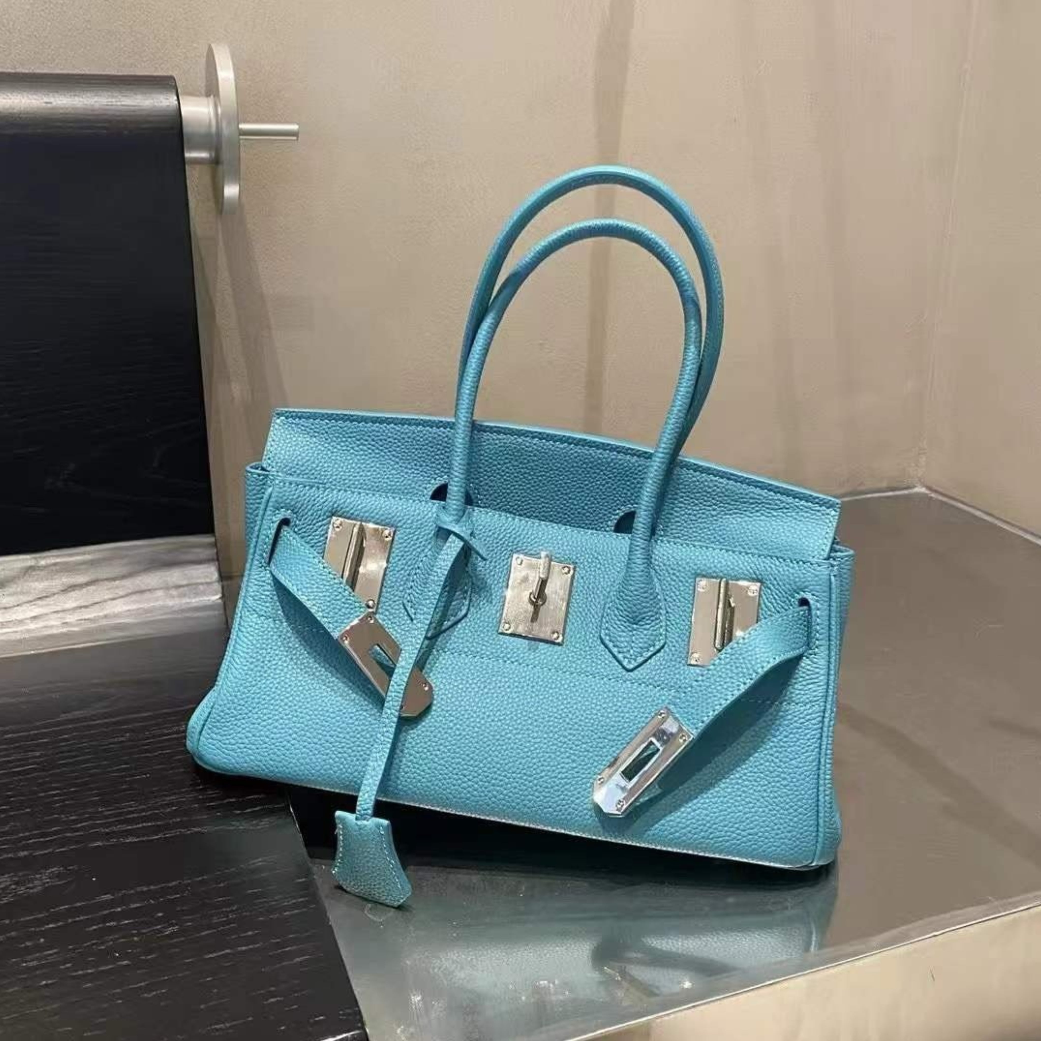 お色は高級感溢れるブルー、ピンク、ブラック、エトープ、アイボリーの5色展開で、シンプルながらも洗練されたデザインが特長です。サイズはW33H20D18cmで、牛革製トゴ仕様の素材を採用しており、長くご愛用いただける品質を誇ります。