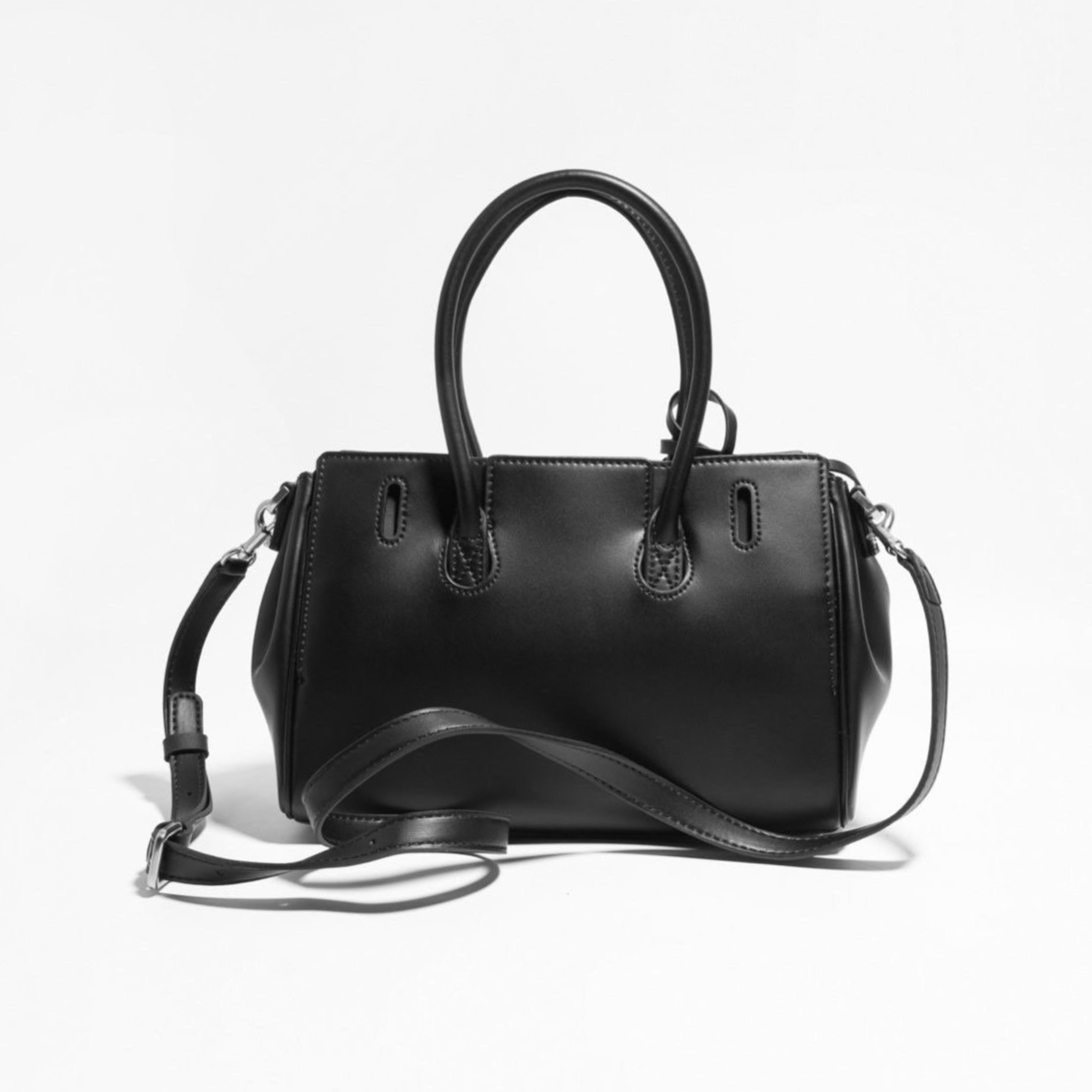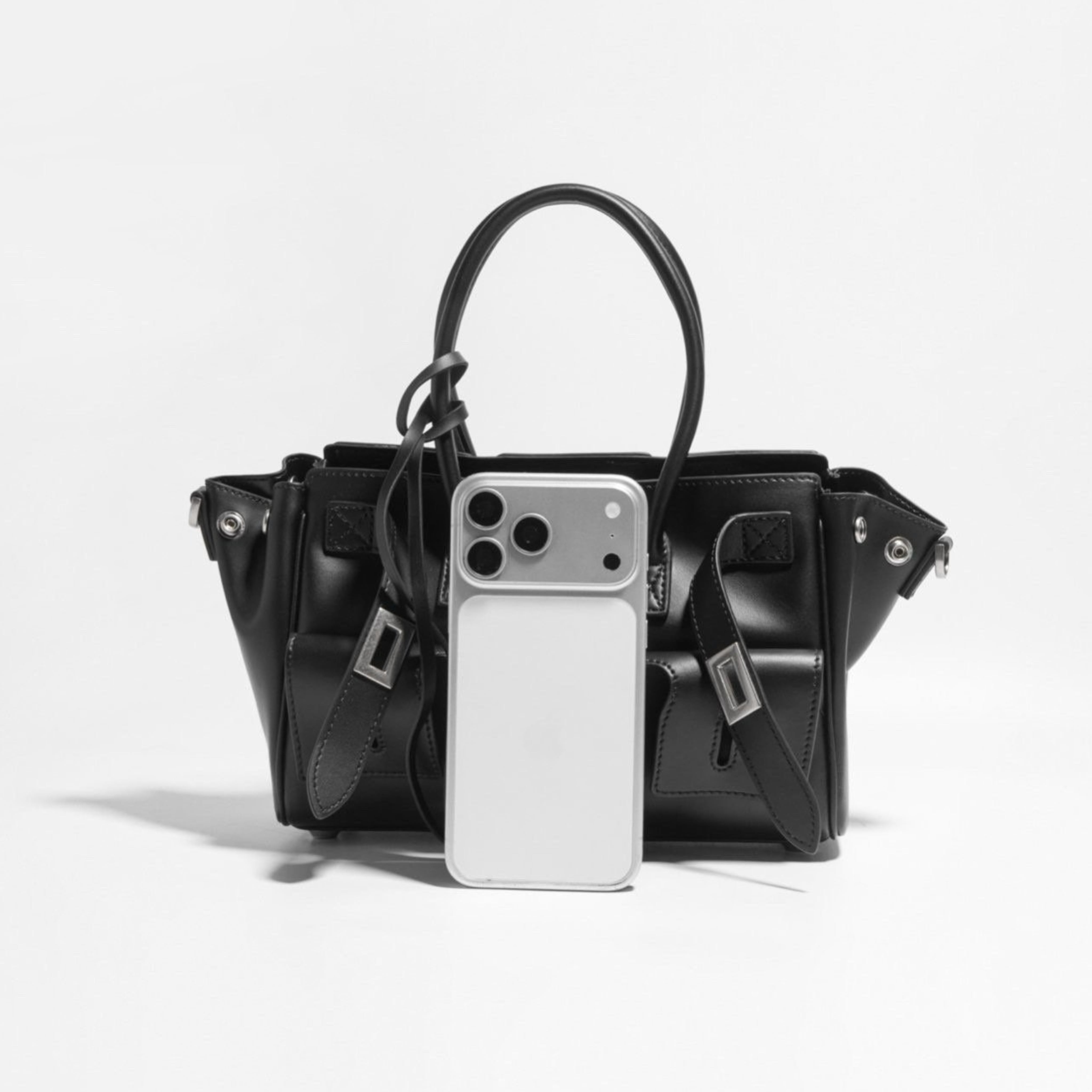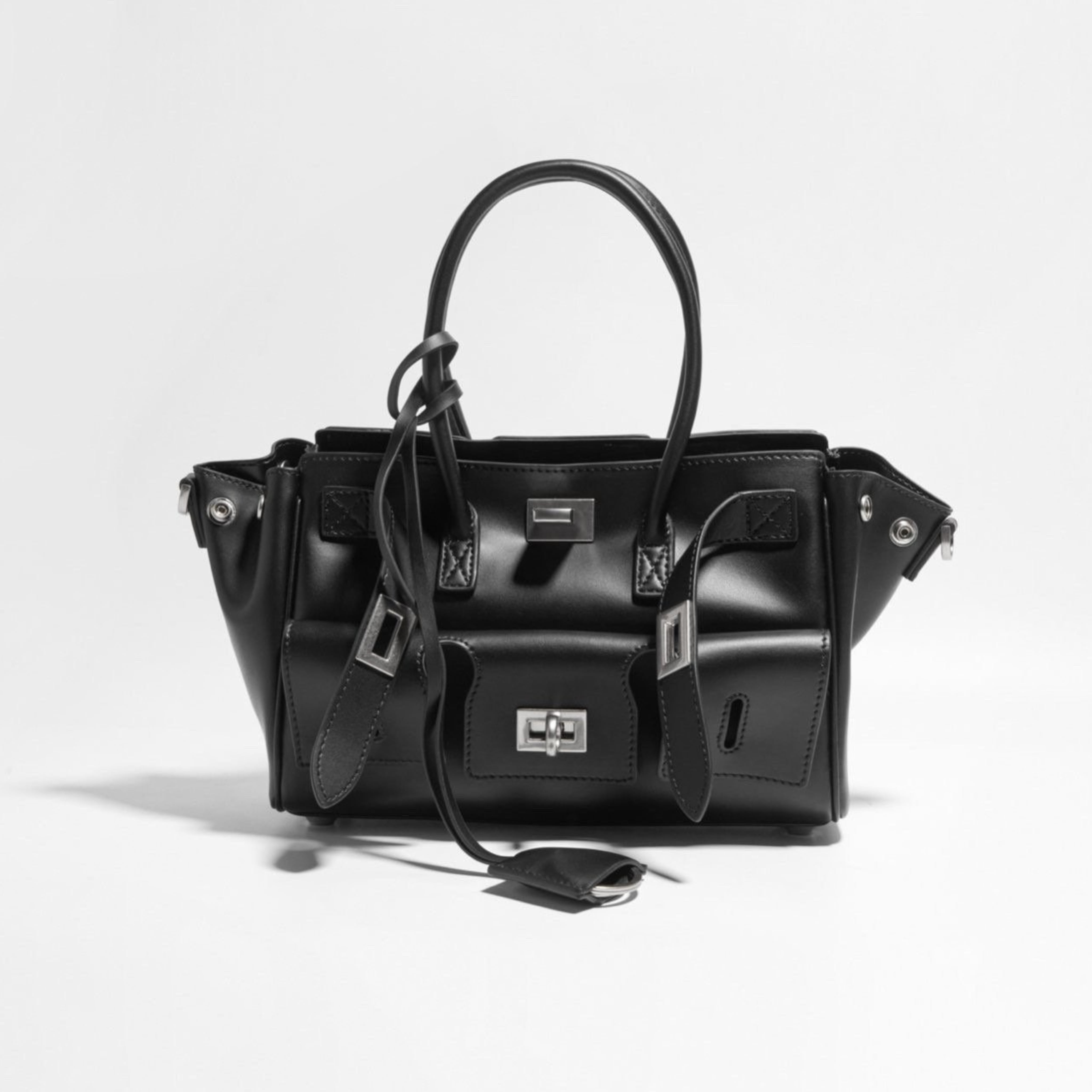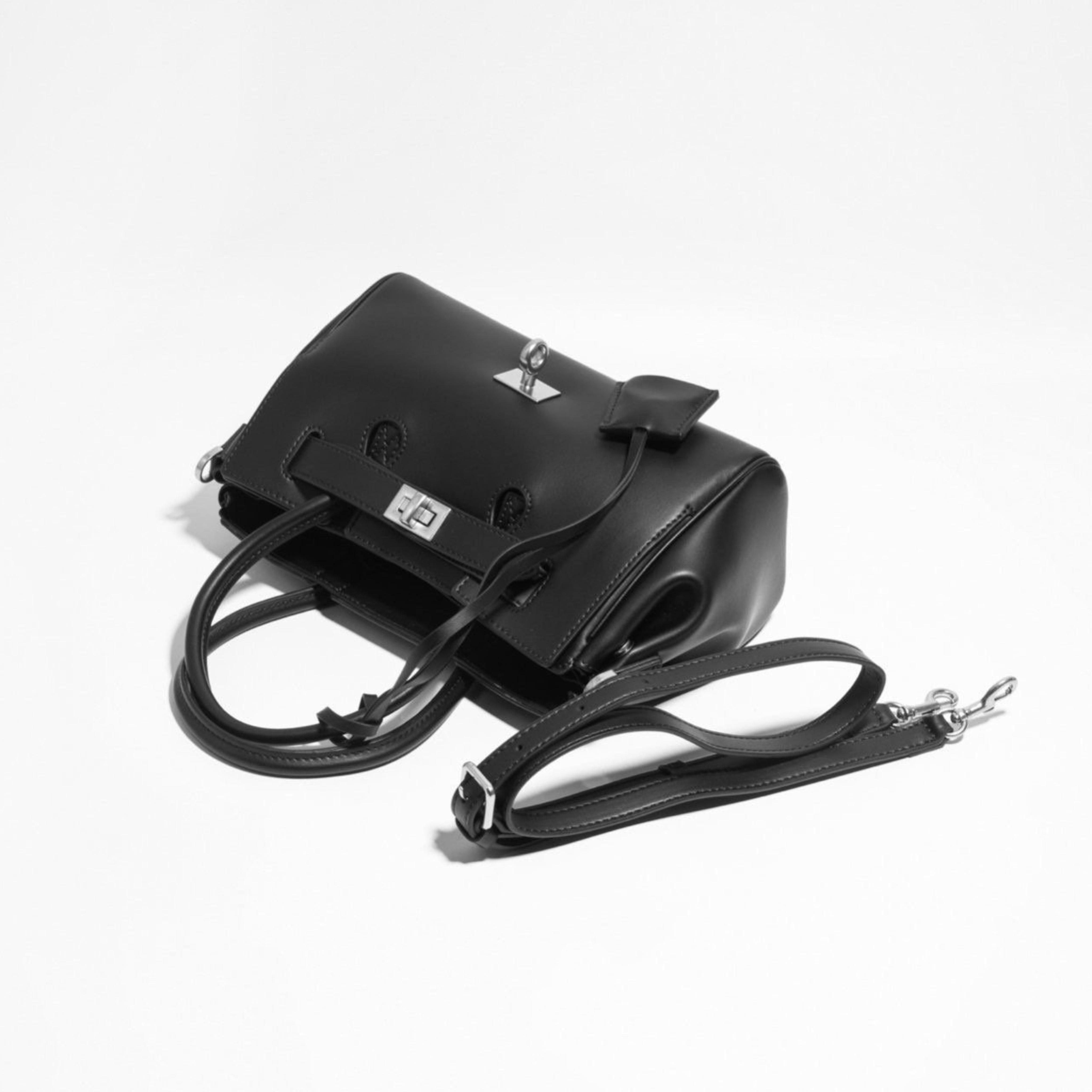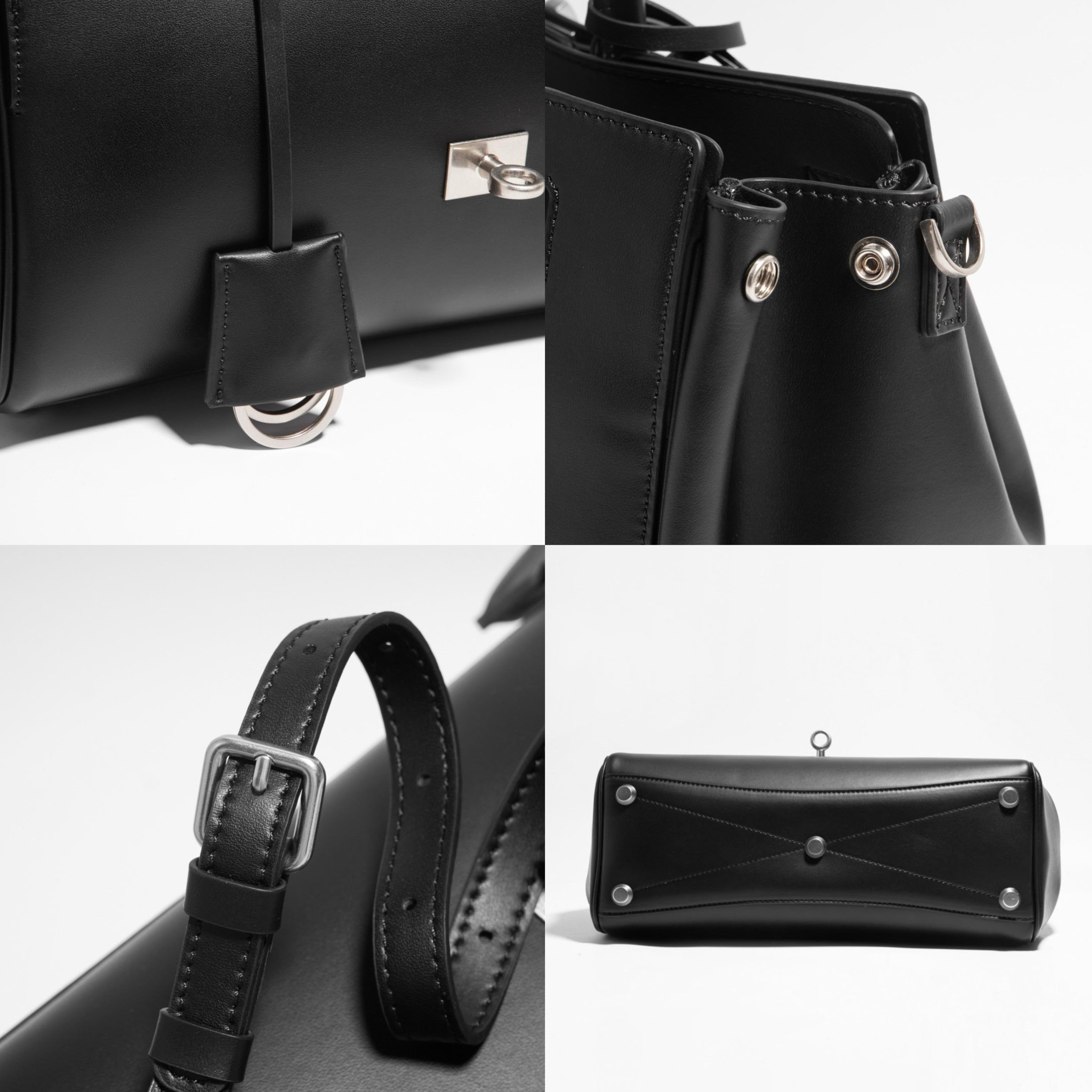 洗練されたバックルデザインが特徴のこのバッグは、スタイリッシュでお洒落な印象を与えます。お色はブラックのワンカラーです。サイズはW25H17D10cm、牛革製の質感が高級感を演出し、長くご愛用いただける品質を誇ります。