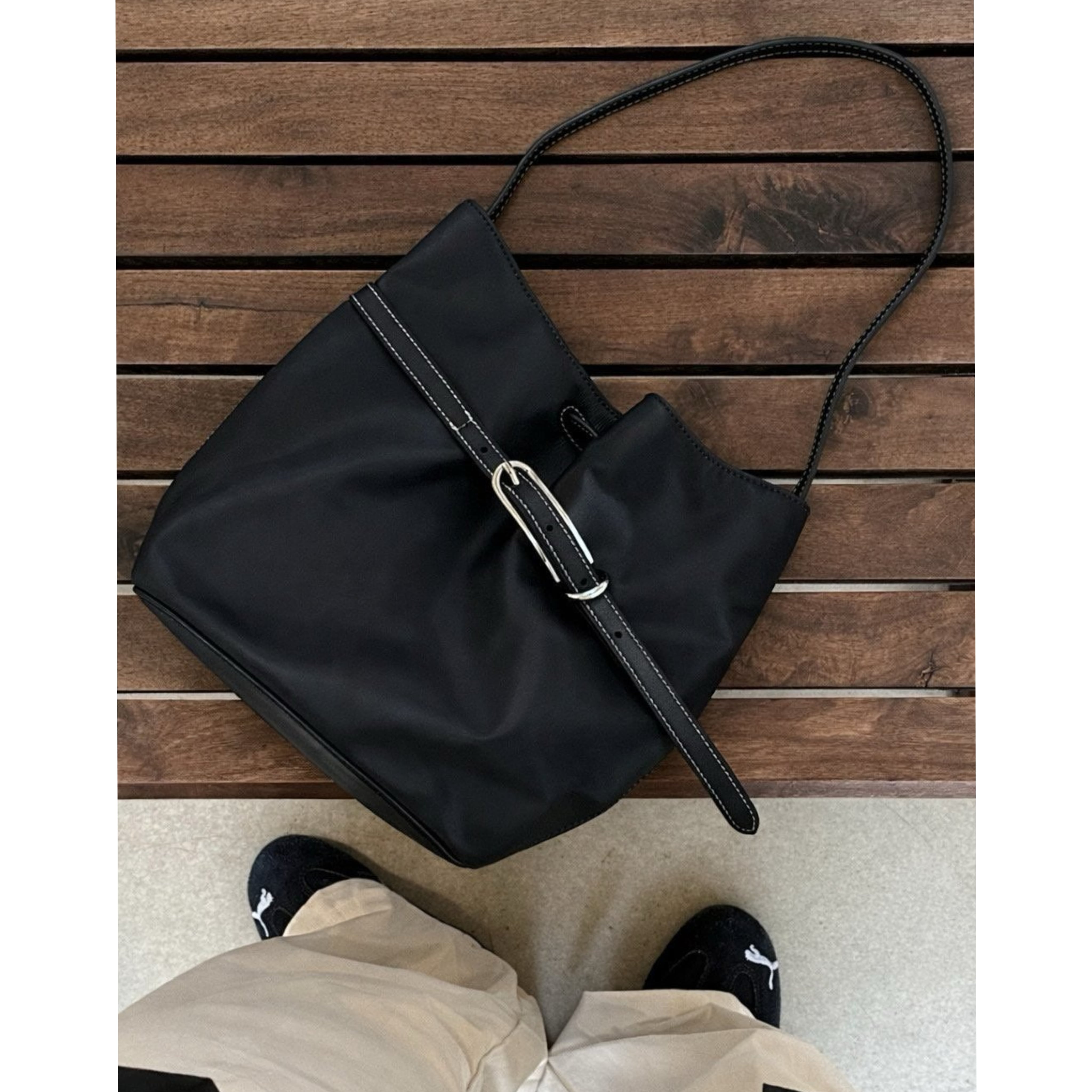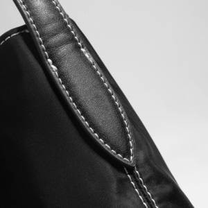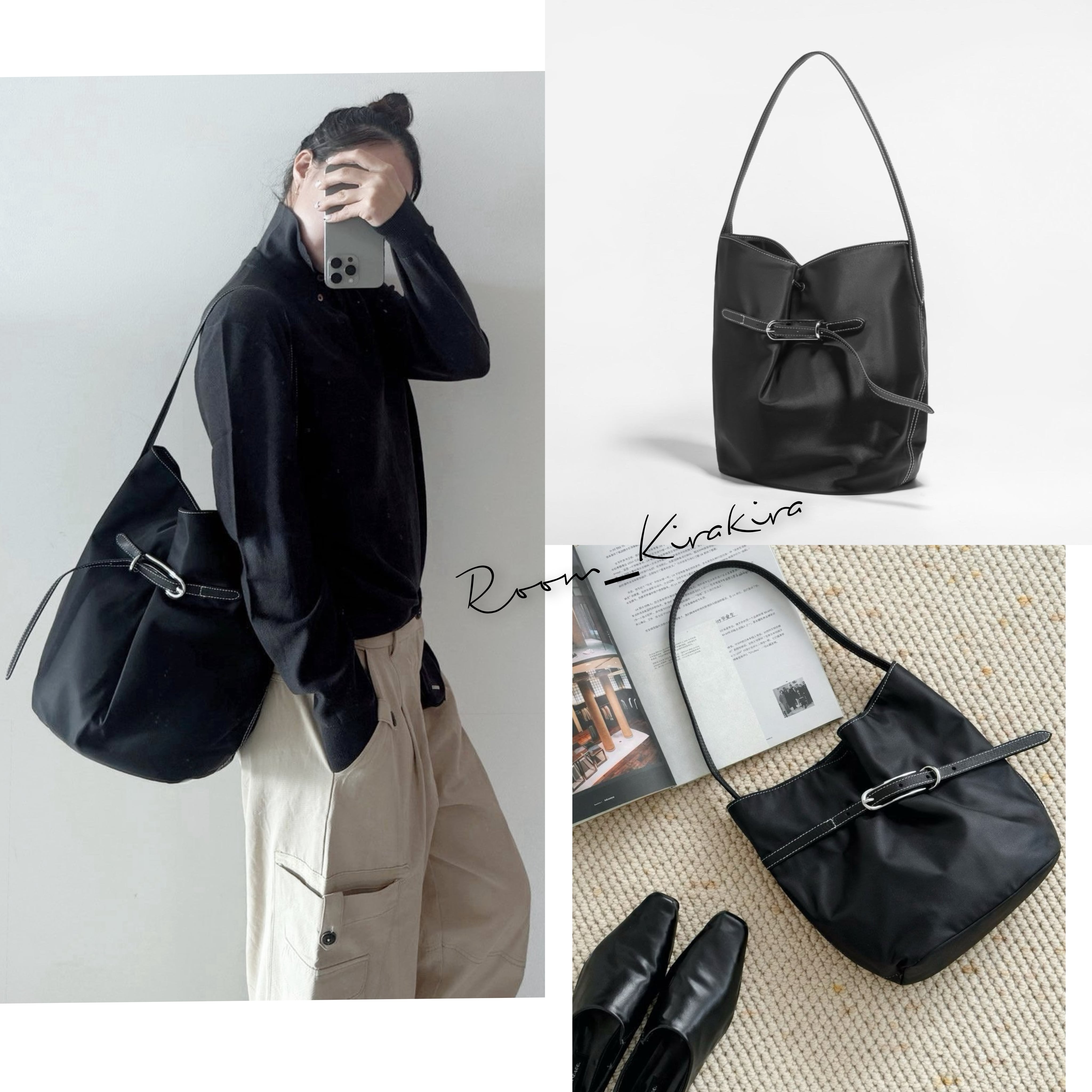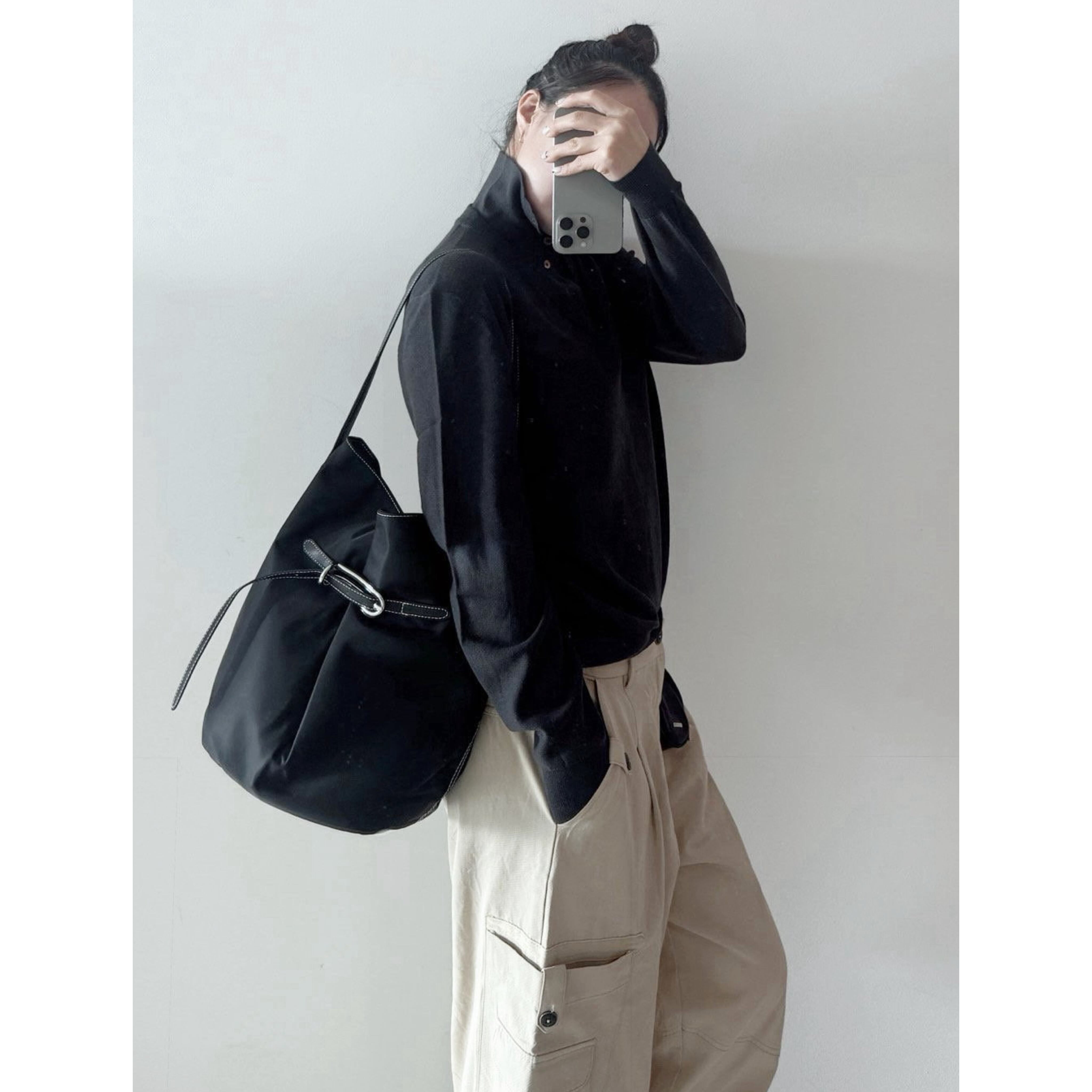 撥水性に優れたナイロン素材を使用したこのショルダーバッグは、スタイリッシュなバックルデザインと美しいステッチが特徴です。サイズはW32H32D18cmで、シンプルなブラックのワンカラーがどんなコーディネートにもマッチします。