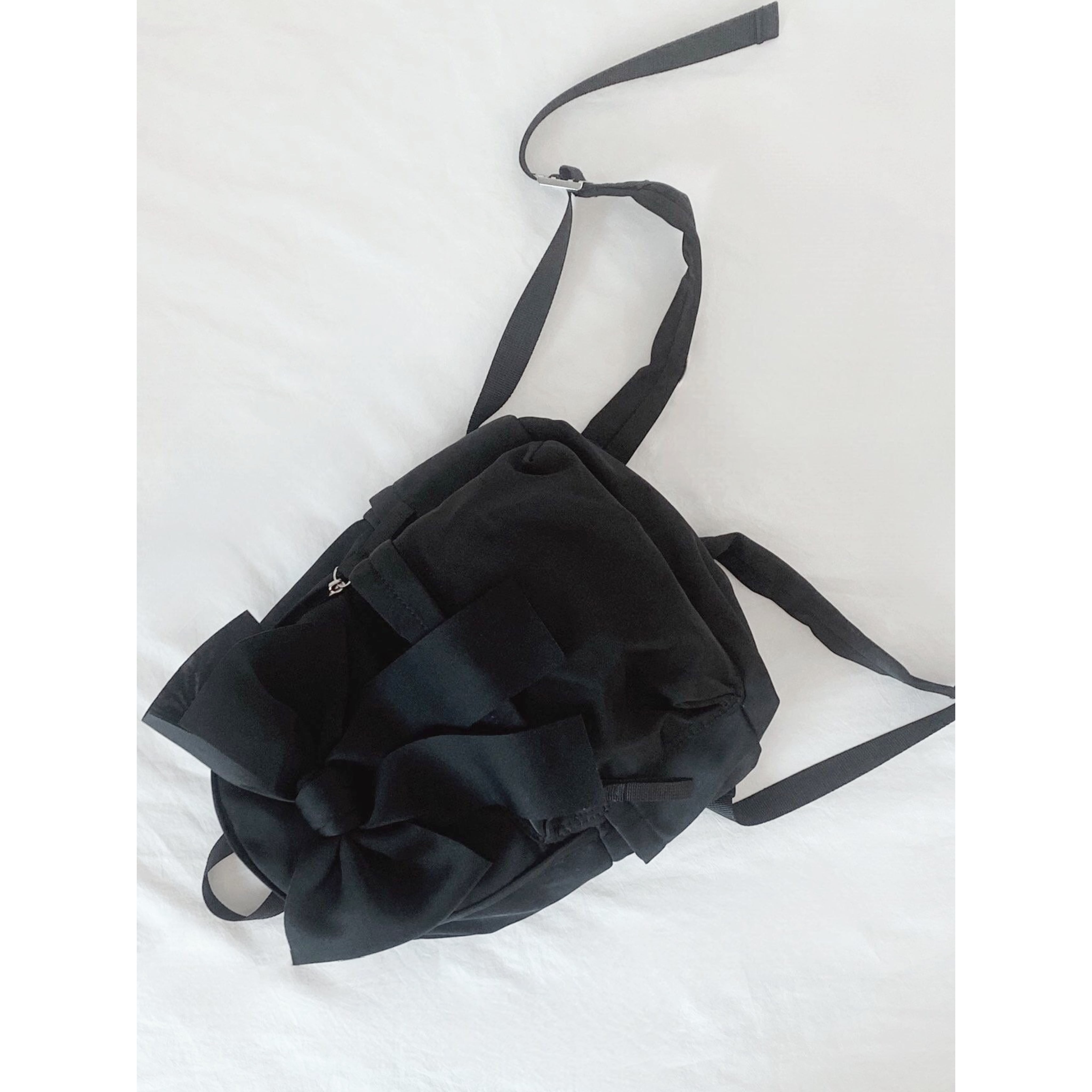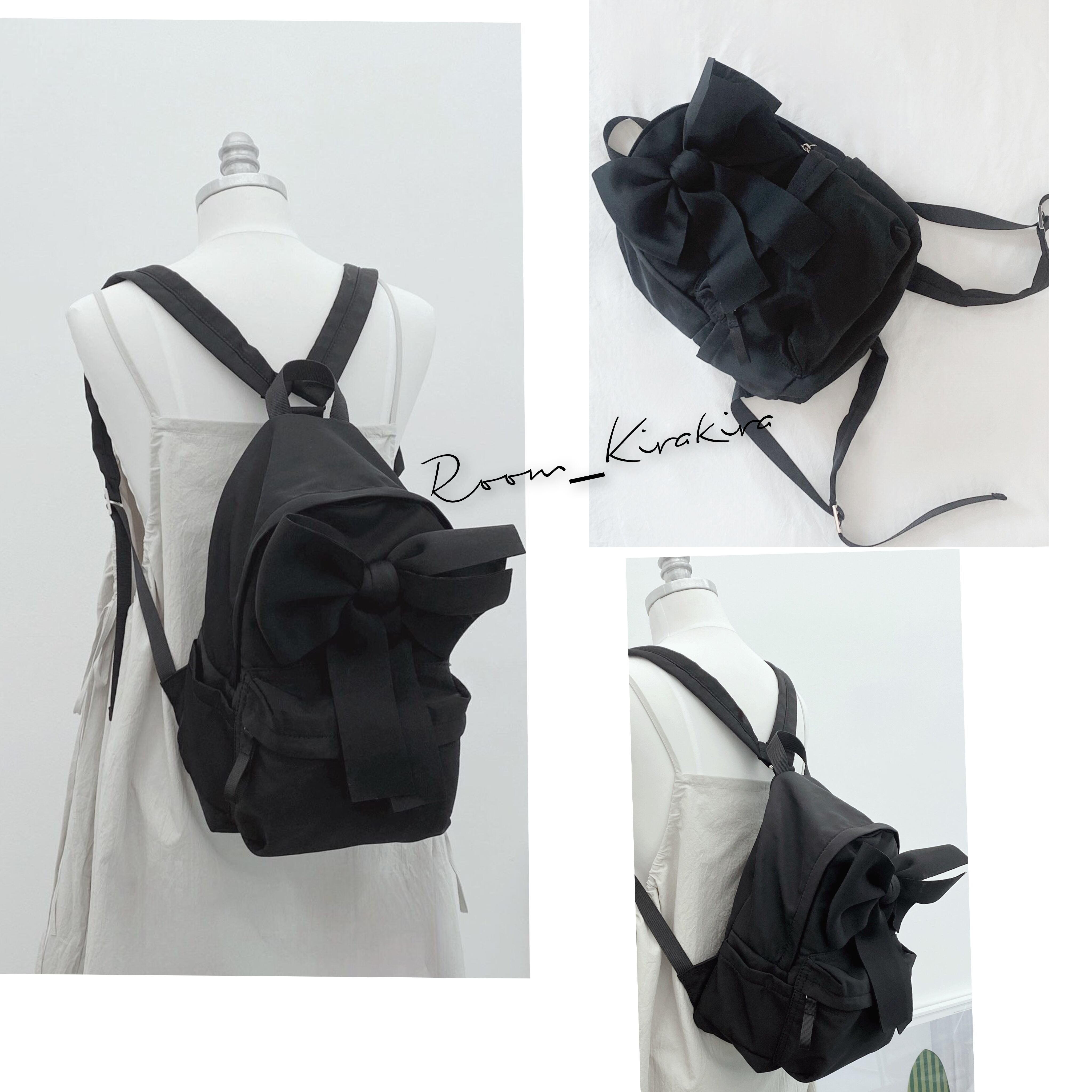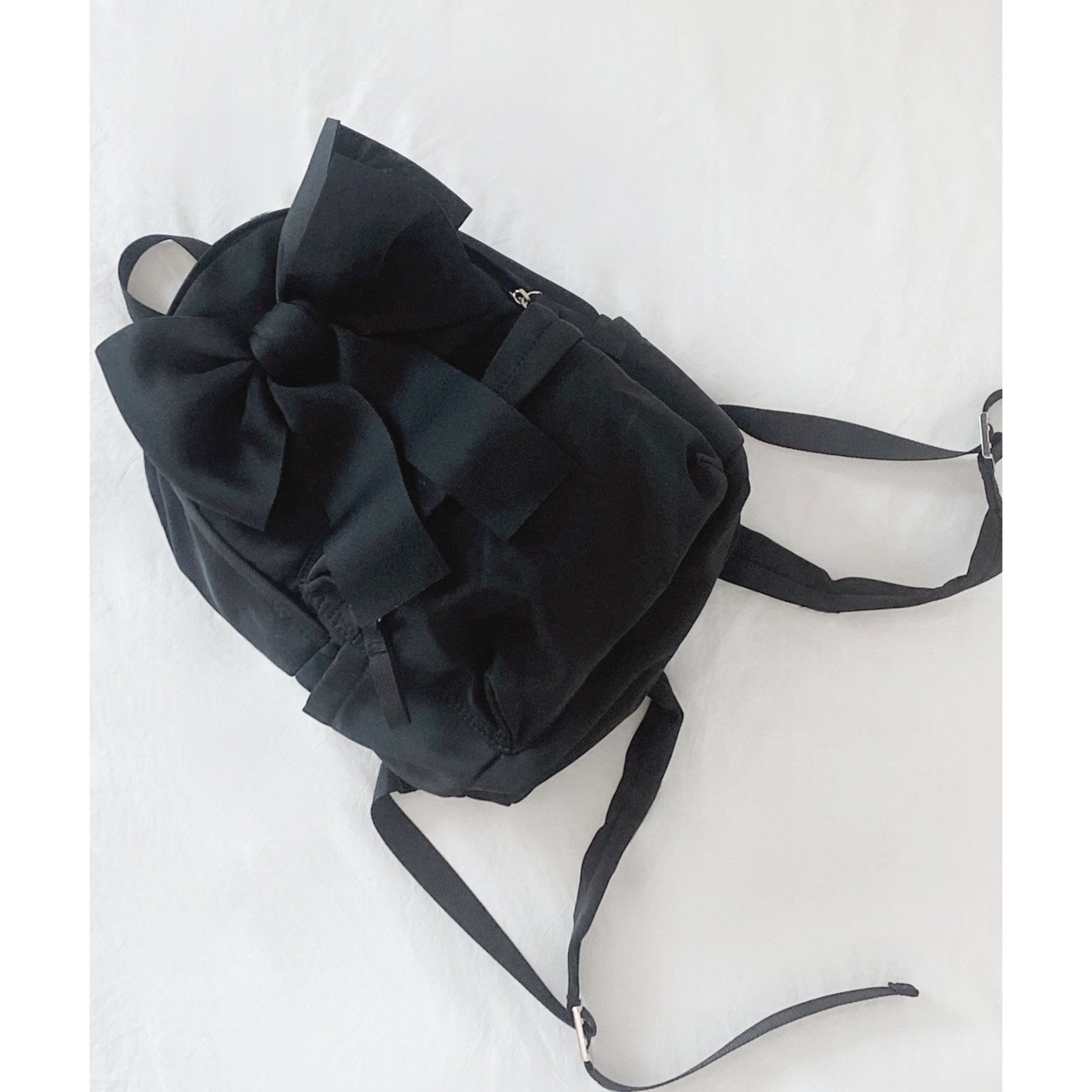 撥水性に優れたナイロン素材を使用したこのリュックは、とても軽く、快適な持ち運びを実現しています。サイズはW21H30D14cmで、シンプルなブラックのワンカラーがさまざまなスタイルに合わせやすくなっています。大きなリボンがデザインのアクセントとなり、可愛らしさとお洒落さを両立させています。