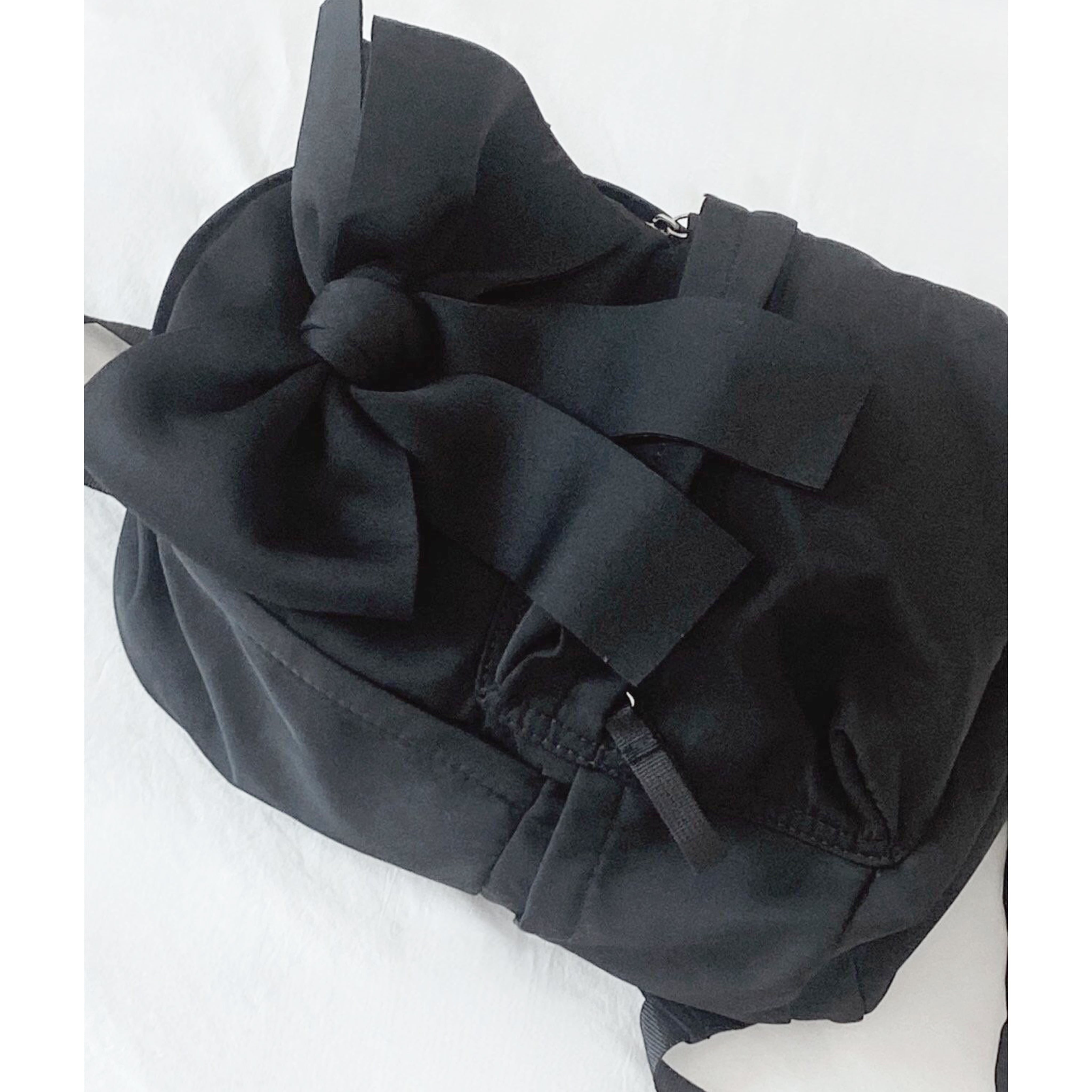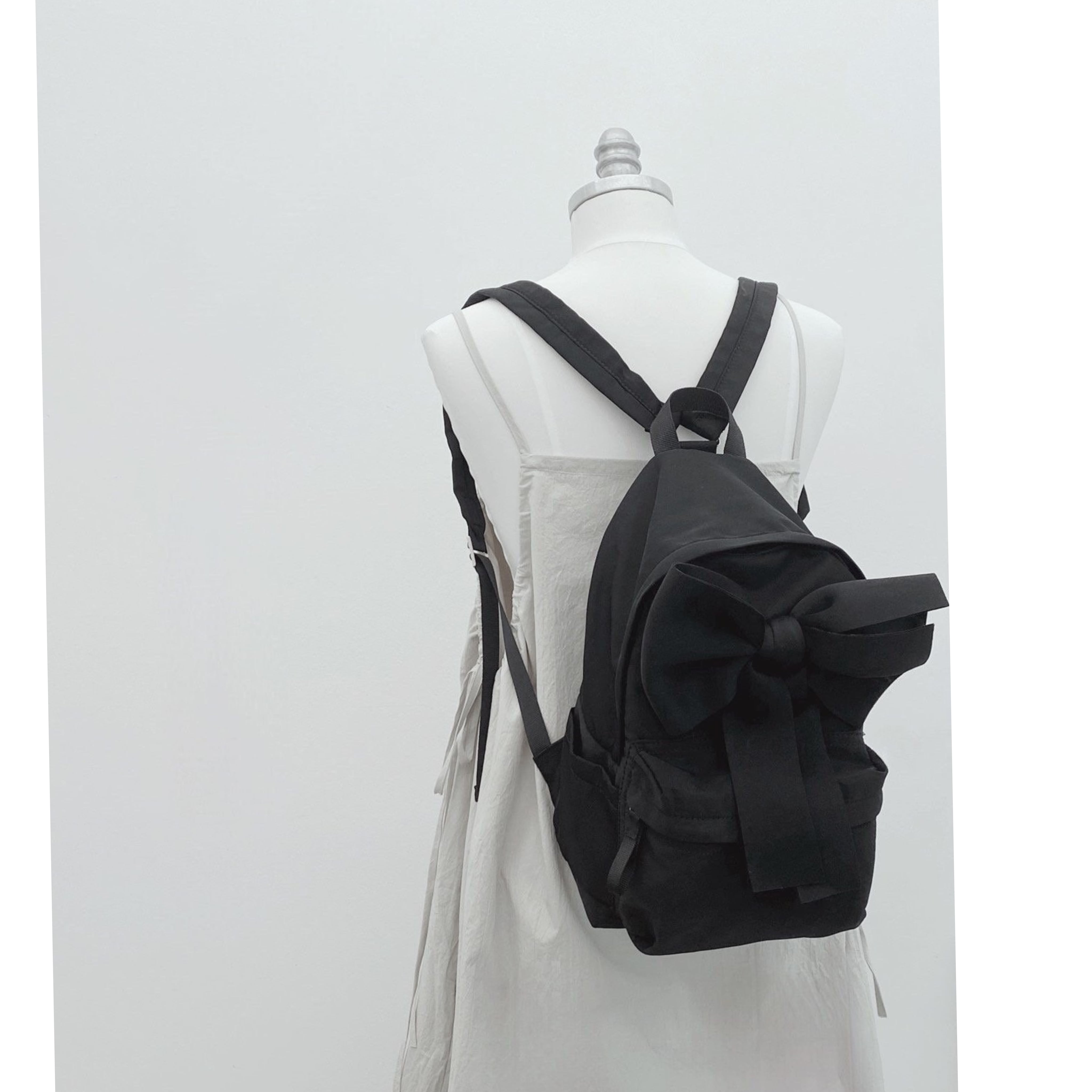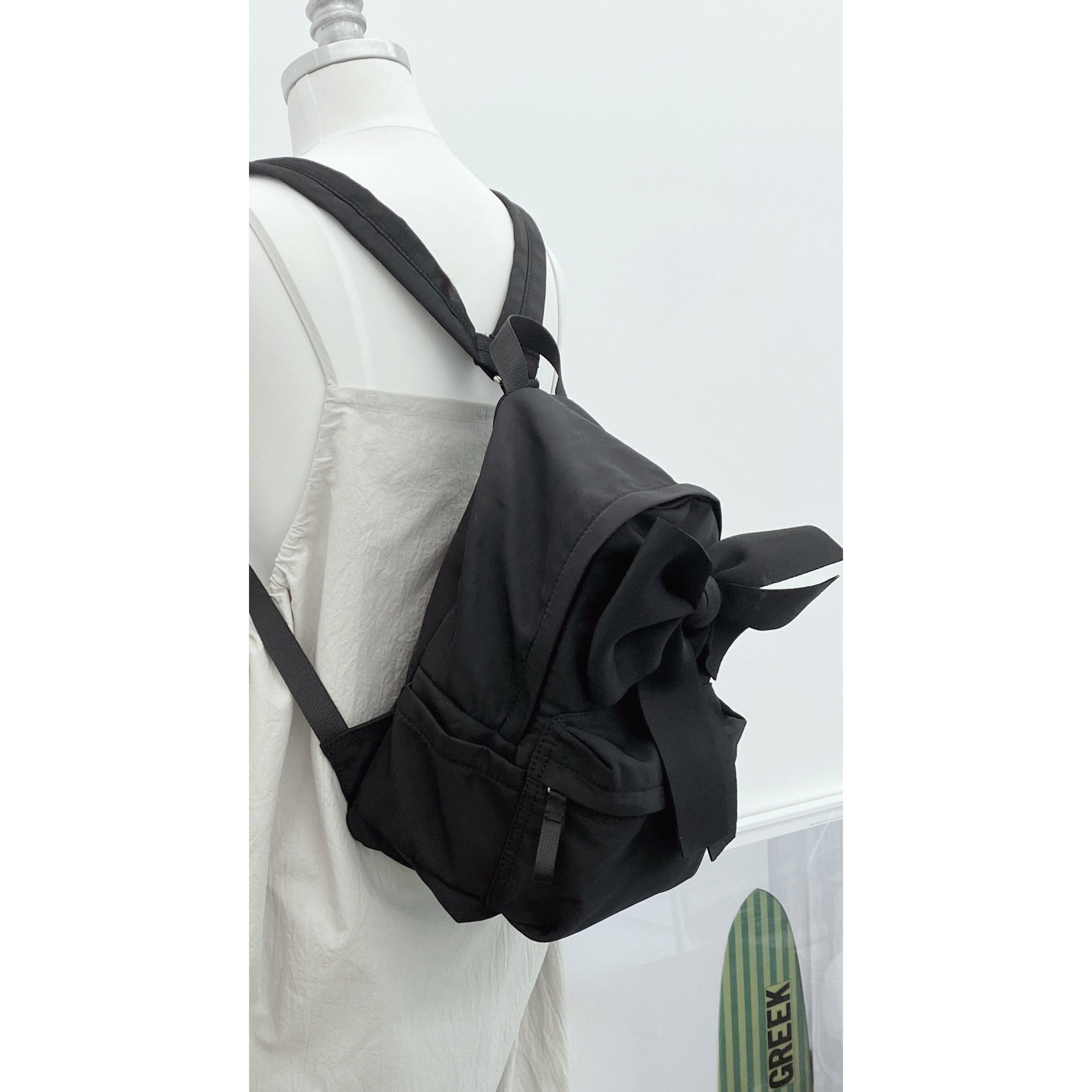 撥水性に優れたナイロン素材を使用したこのリュックは、とても軽く、快適な持ち運びを実現しています。サイズはW21H30D14cmで、シンプルなブラックのワンカラーがさまざまなスタイルに合わせやすくなっています。大きなリボンがデザインのアクセントとなり、可愛らしさとお洒落さを両立させています。