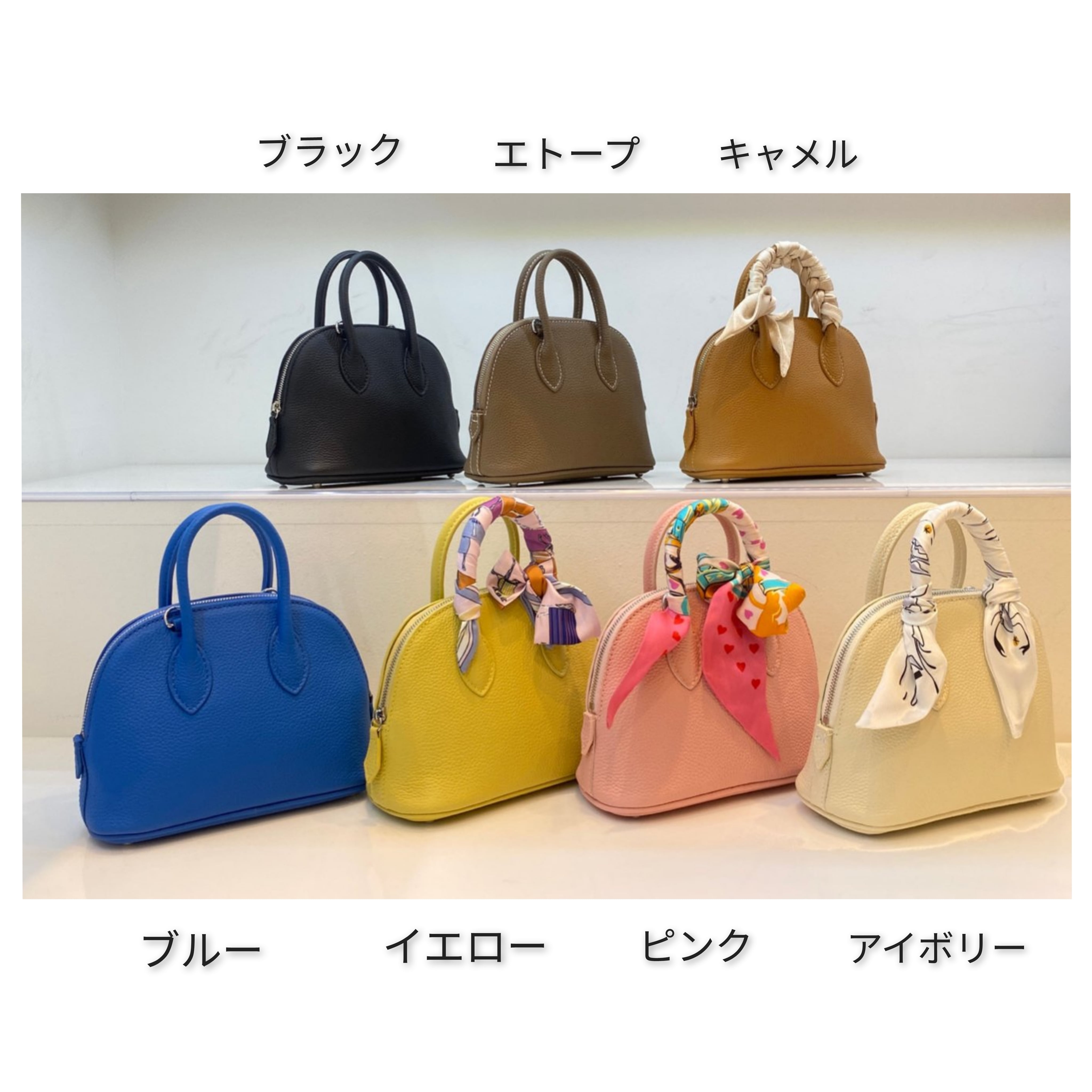 お色はブラック、エトープ、キャメル、ブルー、イエロー、ピンク、アイボリー。